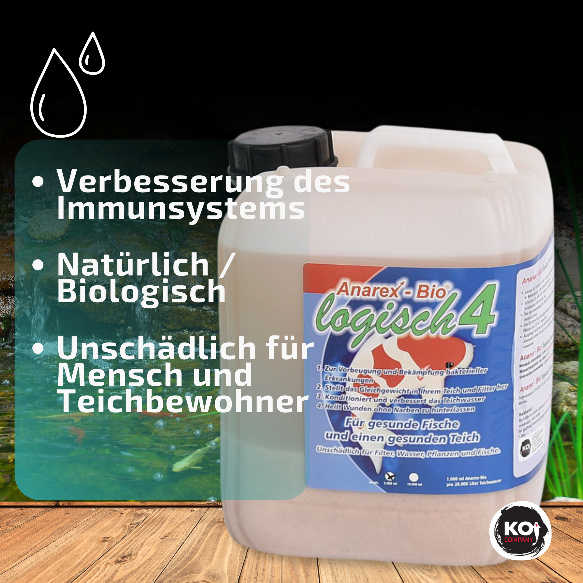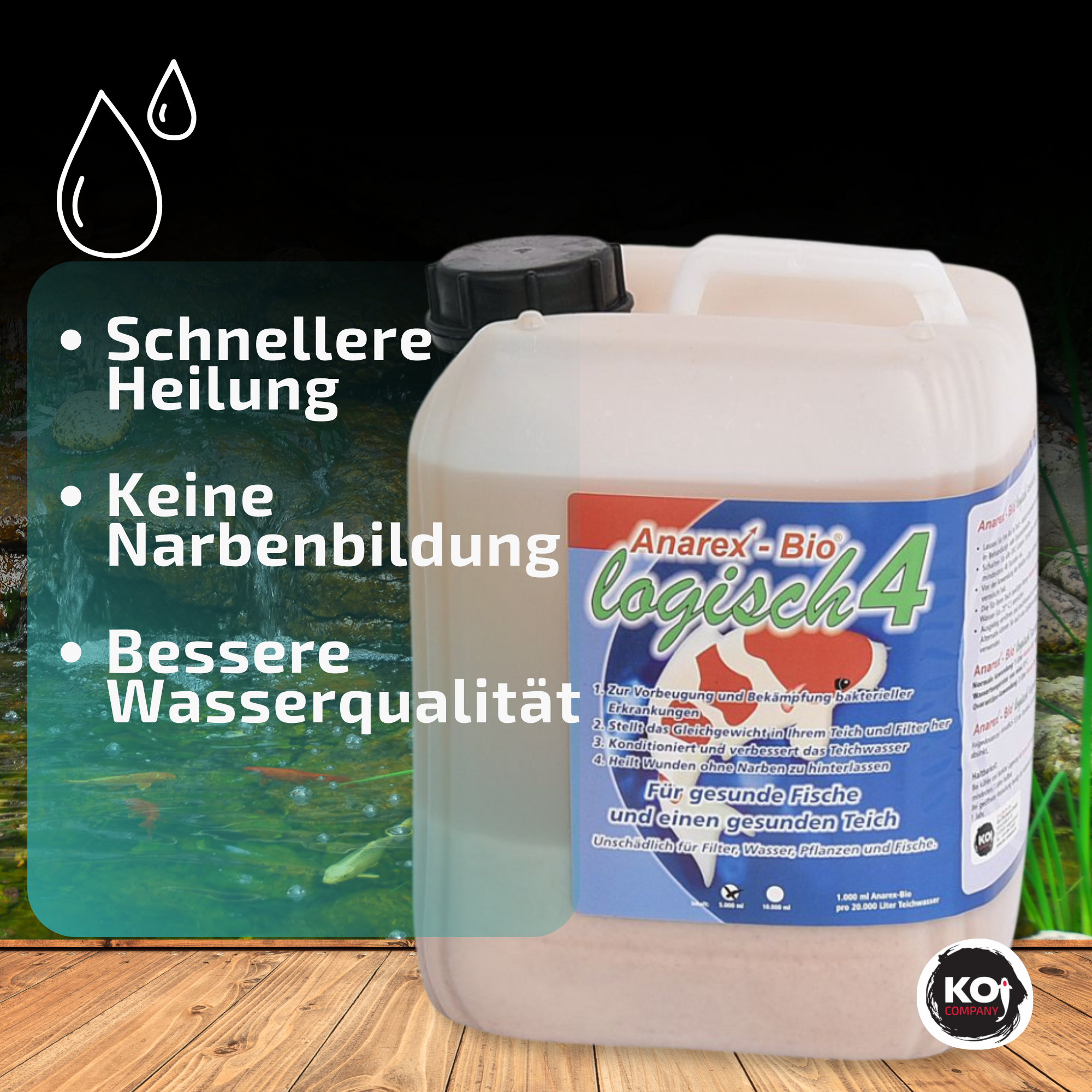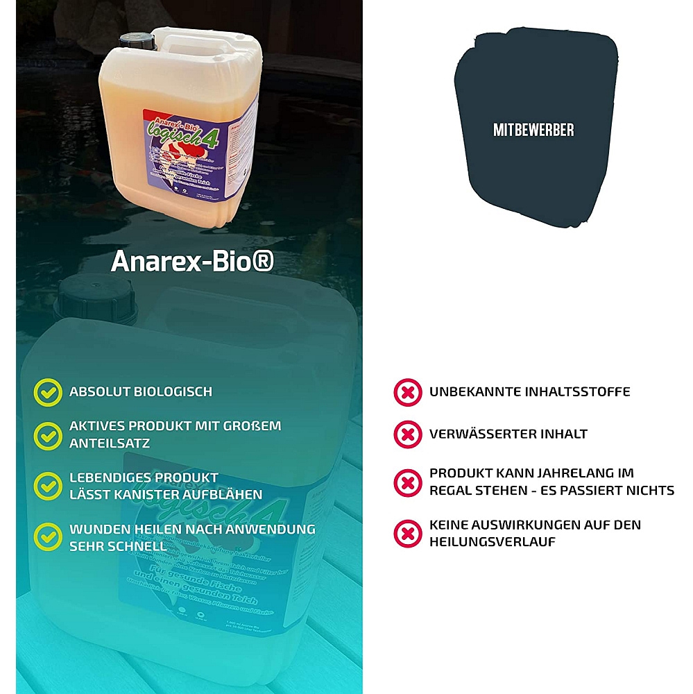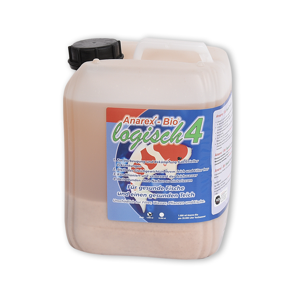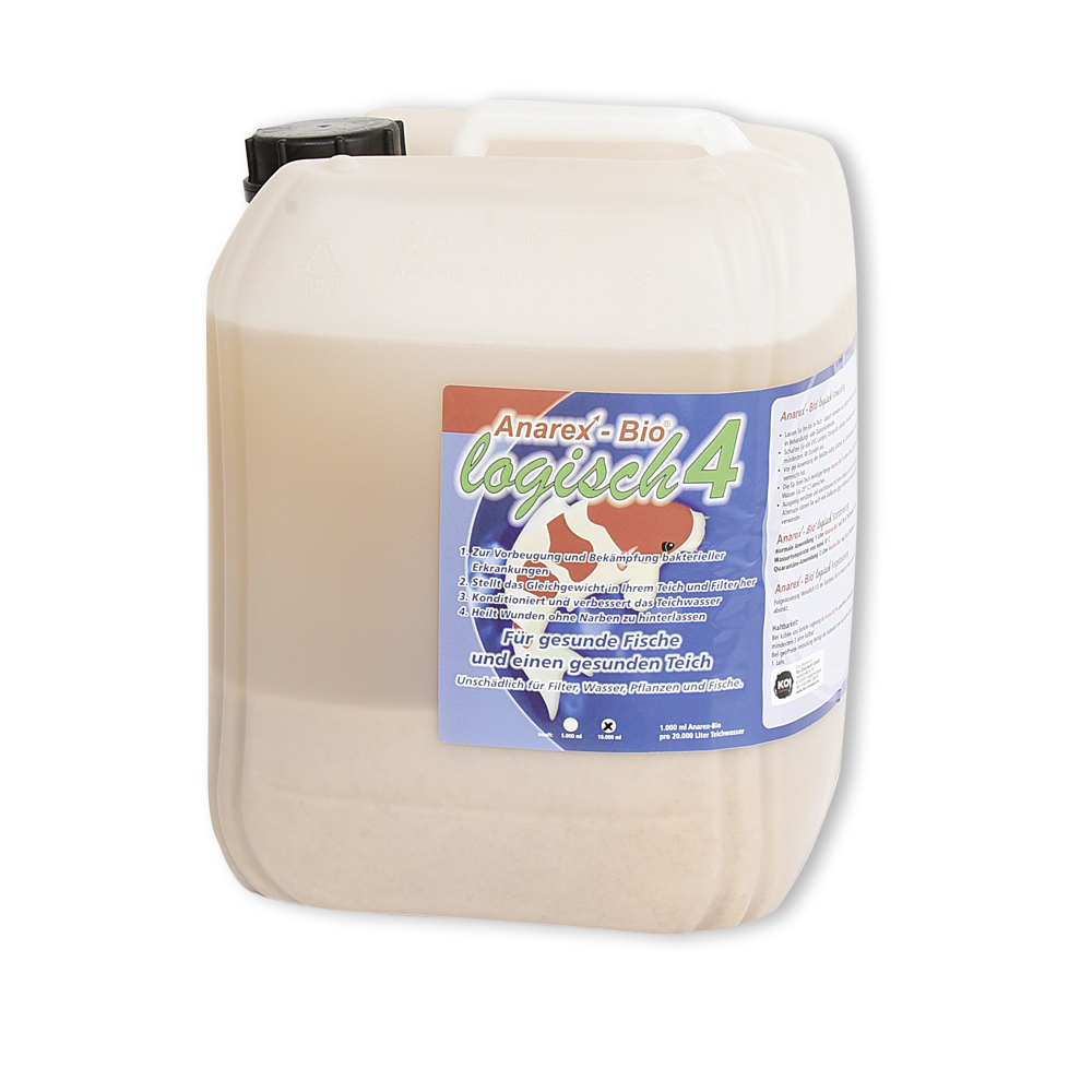Anarex-Bio® logisch4 dient in de eerste plaats ter voorkoming van bacteriële aandoeningen en ondersteunt bovendien het herstel van uw koi – zonder littekens achter te laten. Bovendien herstelt Anarex-Bio® logisch4 het bacteriële evenwicht in uw vijver en filter en verbetert het de waterkwaliteit van uw vijverwater.