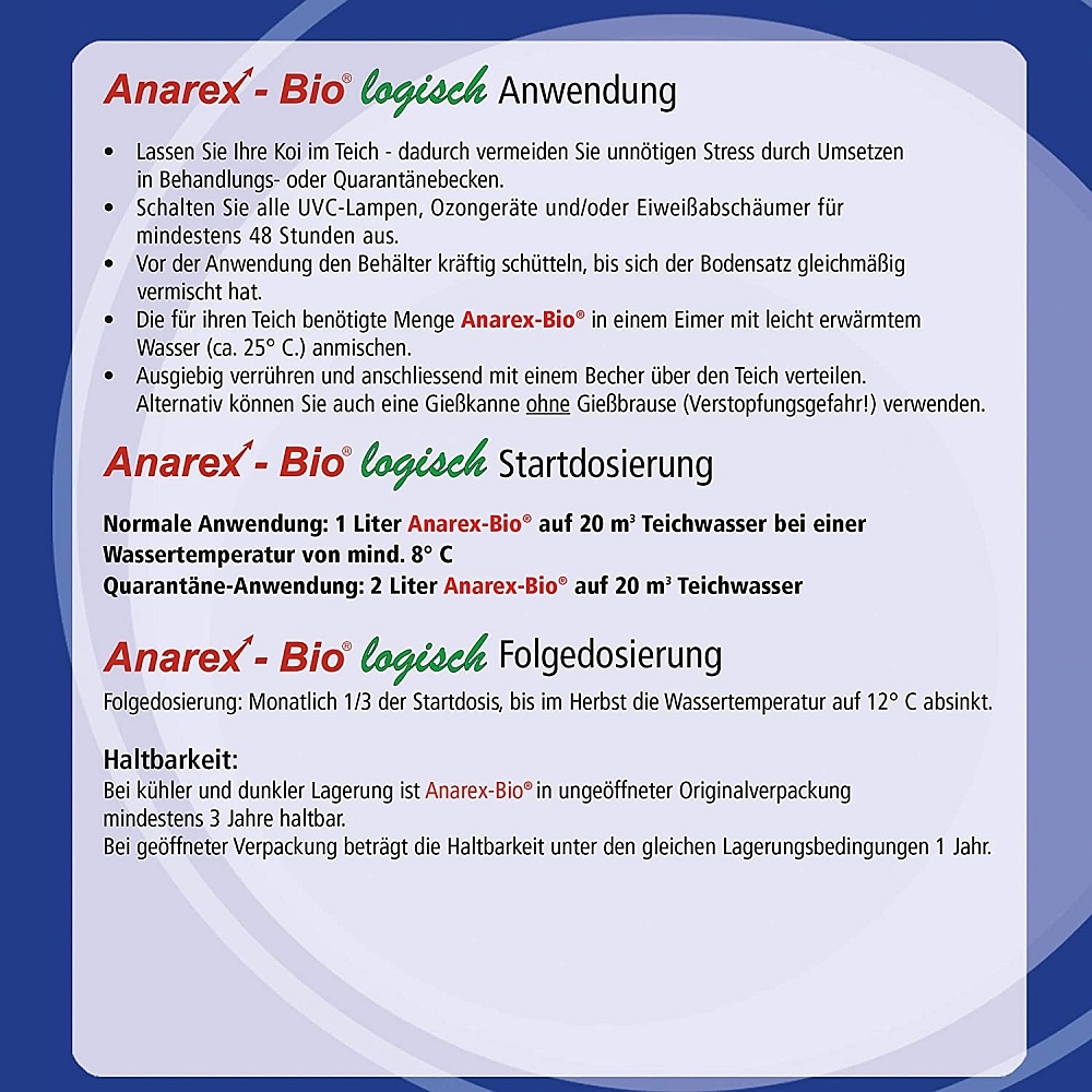 Schud de verpakking goed voor gebruik van Anarex-Bio®, zodat de inhoud en het bezinksel goed gemengd worden. Doe de voor uw vijver benodigde hoeveelheid Anarex-Bio® in een emmer met ongeveer 50% vijverwater en 50% lauw leidingwater, zodat de watertemperatuur in de emmer ongeveer 23° tot 26°C bedraagt. Roer, wacht 5 minuten en verdeel het mengsel over de vijver. Belangrijk: niet met een gieter!