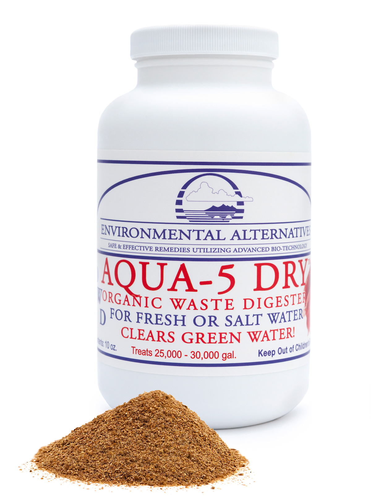 Aqua-5 Dry is gezonde biologie en goed voor het water en de vissen. De vissen vinden het prettig en voelen zich er helemaal thuis. Er is dus geen reden tot paniek als dergelijke dingen zich voordoen, maar men moet met een rustige hand en op biologische wijze ingrijpen, zodat naast de vissen ook de koihouder tevreden is met de omgeving en zijn lievelingen ook helder kan zien. Een kort algenveld op de vijverwanden is echter een teken van een gezonde natuur en dus positief te beoordelen.