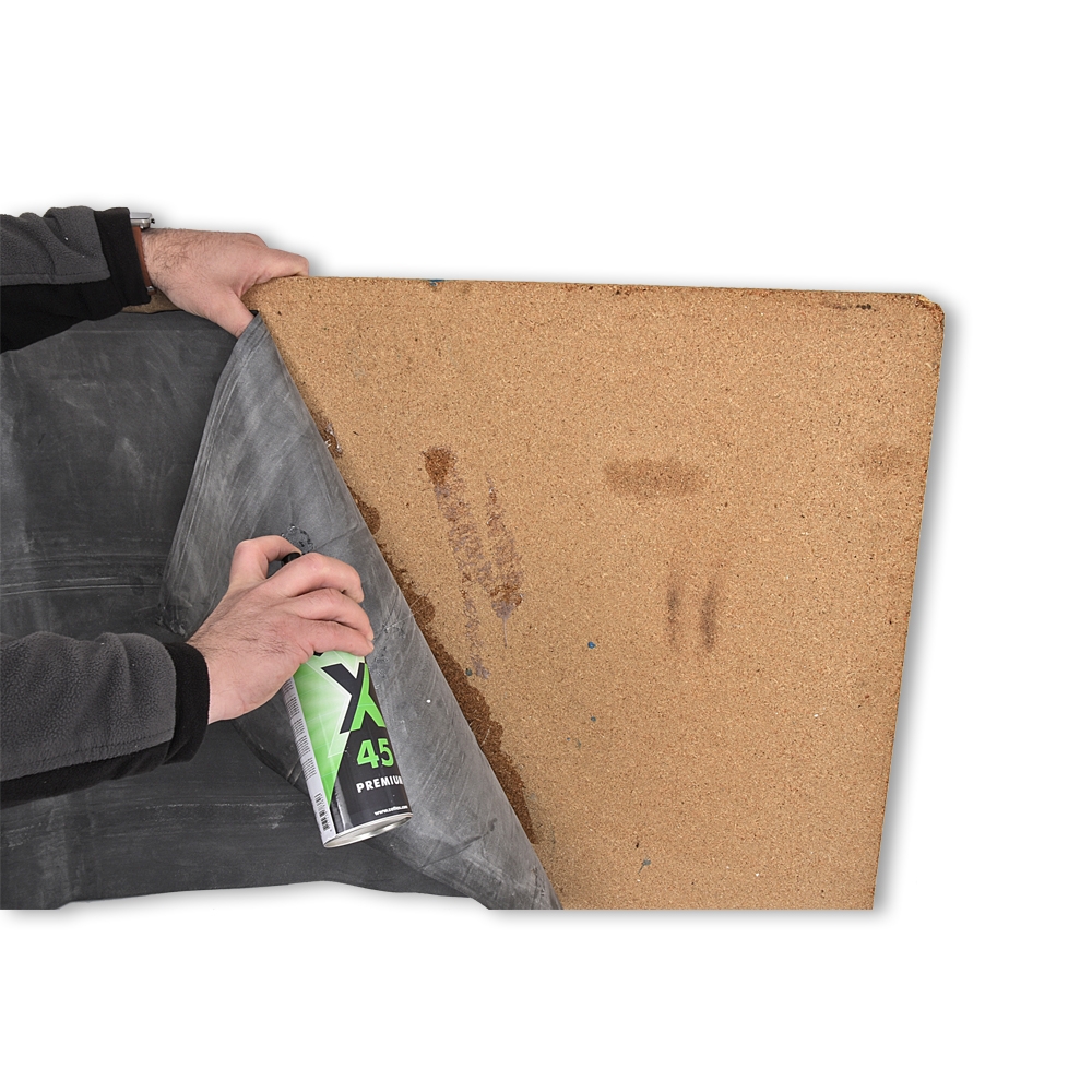 Een afstand van 30 cm tussen de ondergrond en de spuitbus is ideaal. De lijmstroken moeten bij voorkeur zonder overlapping worden aangebracht. Na 2-4 minuten de twee oppervlakken met elkaar verlijmen en stevig aandrukken of aanrollen. Bij overlappende toepassing de open tijd minstens verdubbelen.