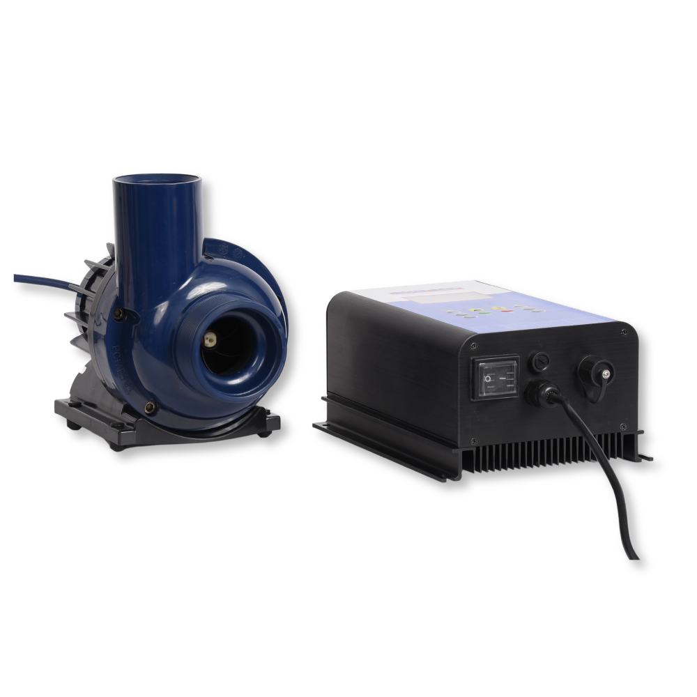 Regelbare energiezuinige vijver- en zwembadpomp met externe regeleenheid.