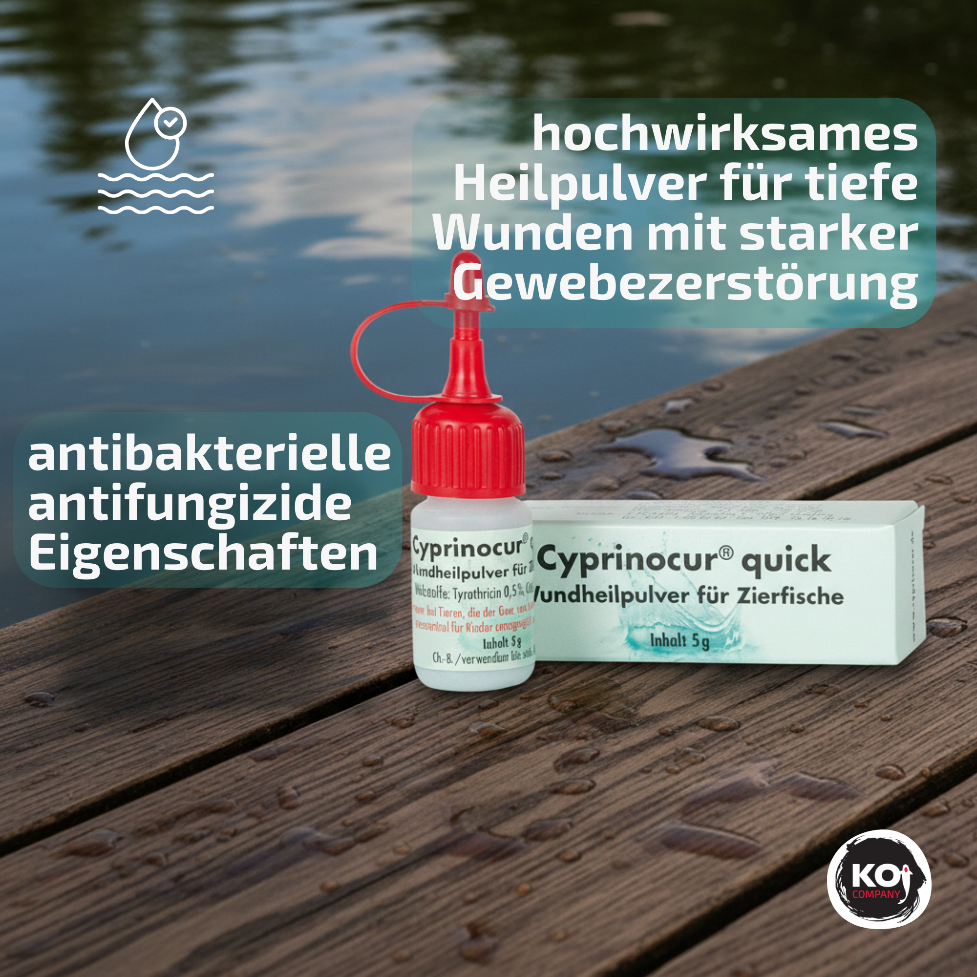 Cyprinocur® Quick wordt uit de fles op het aangetaste gebied gestrooid. Laat het wondgebied niet drogen! Het doorslaggevende voordeel van dit poeder ten opzichte van een zalf is dat u de behandeling kunt uitvoeren zonder de vis te verdoven. Desinfecteer indien nodig vóór de behandeling met een 0,3% waterstofperoxideoplossing. Als u een dikkere poederlaag wilt, bevochtigt u de eerste laag met een beetje water uit een spuitfles en brengt u vervolgens een tweede laag aan.