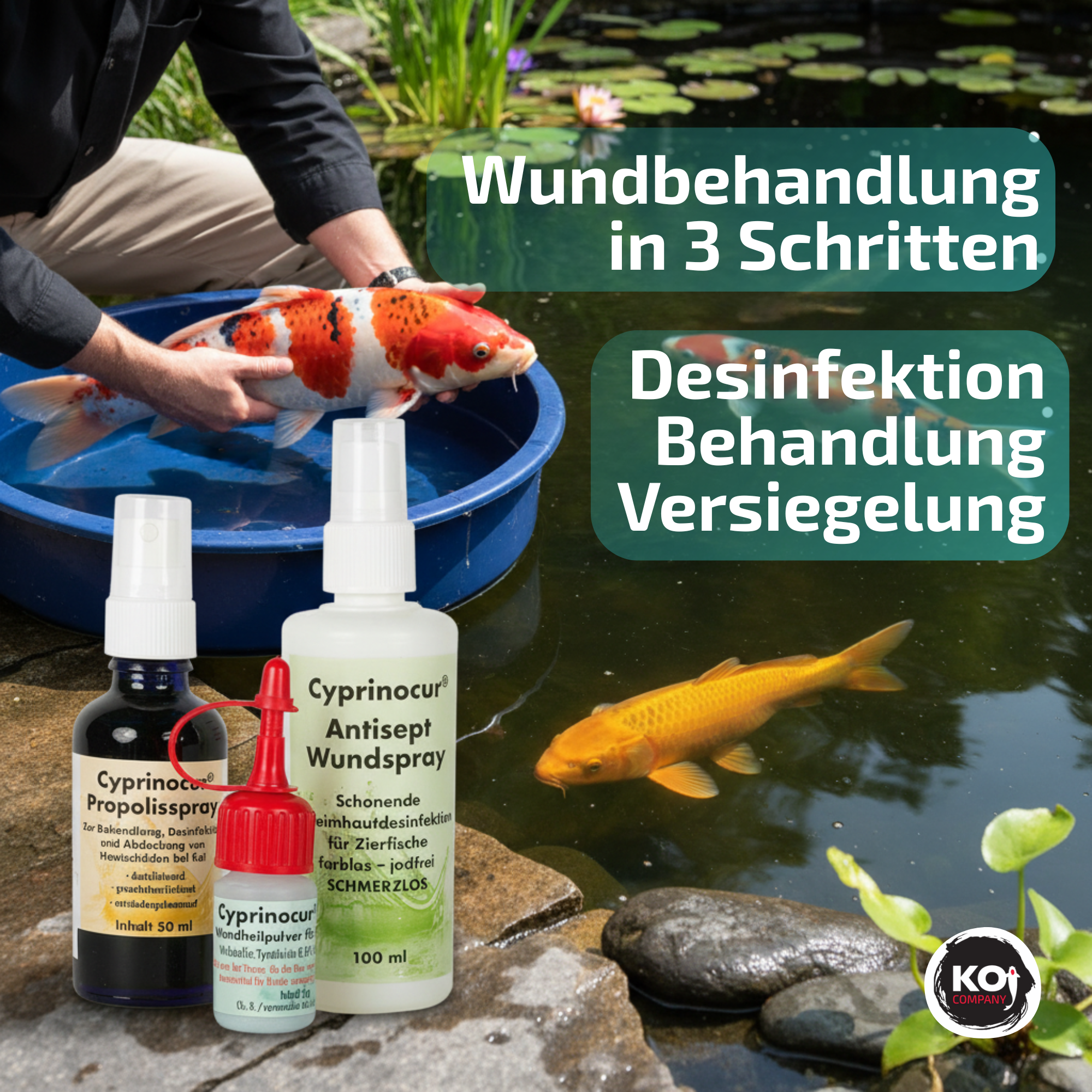 - Behandeling: Cyprinocur Antisept is ontwikkeld om koi-houders de mogelijkheid te bieden wonden snel en voorzichtig te desinfecteren.