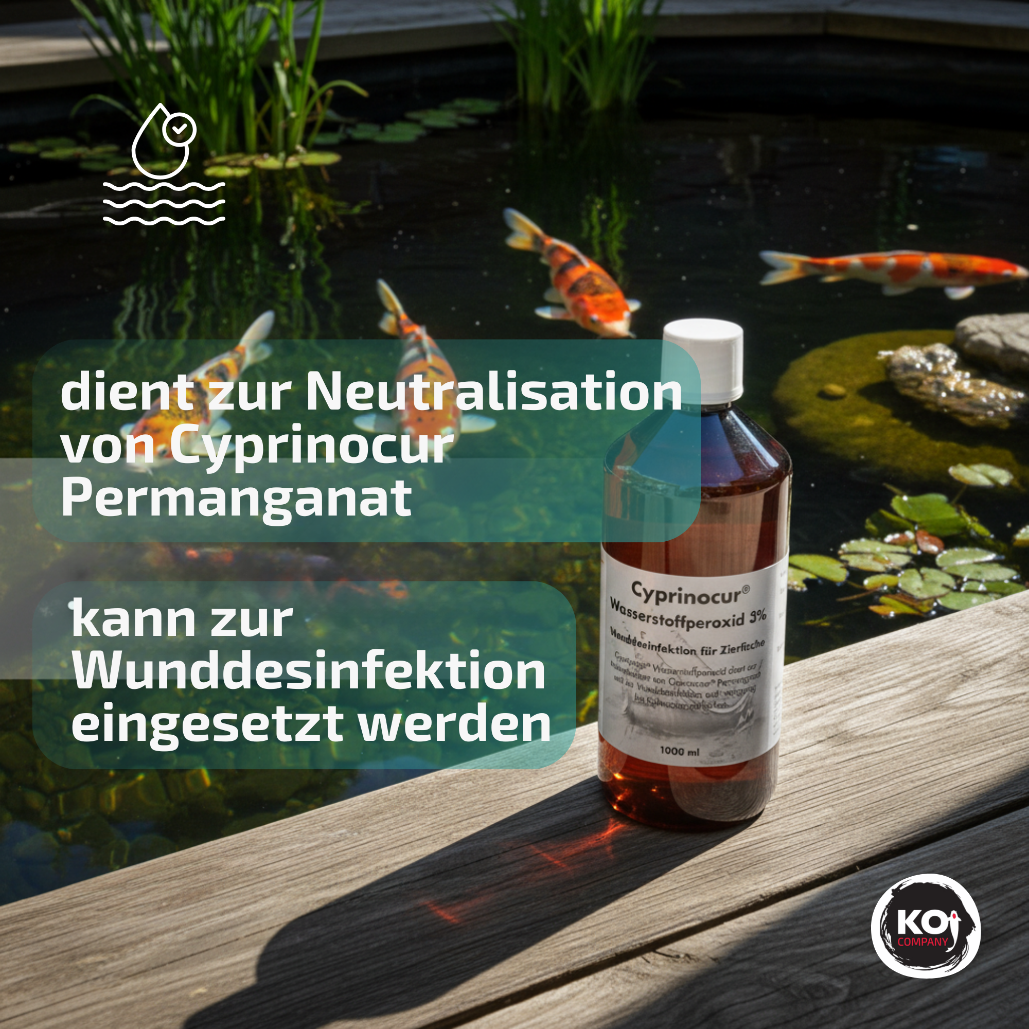 Om Cyprinocur Permanganate te neutraliseren, voegt u 20 ml Cyprinocur Waterstofperoxide toe aan 1.000 l vijvervolume.