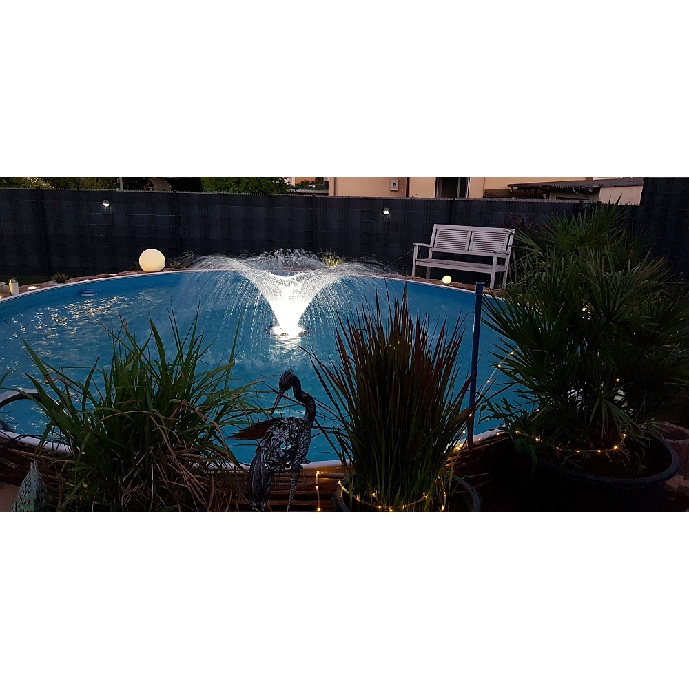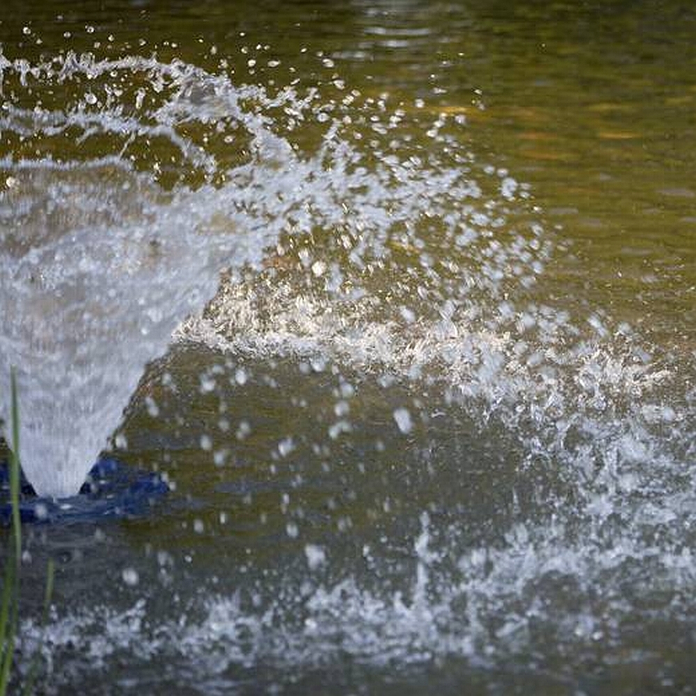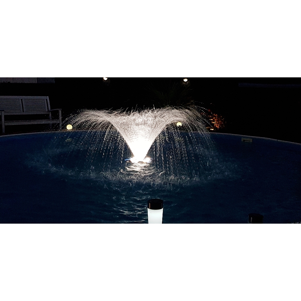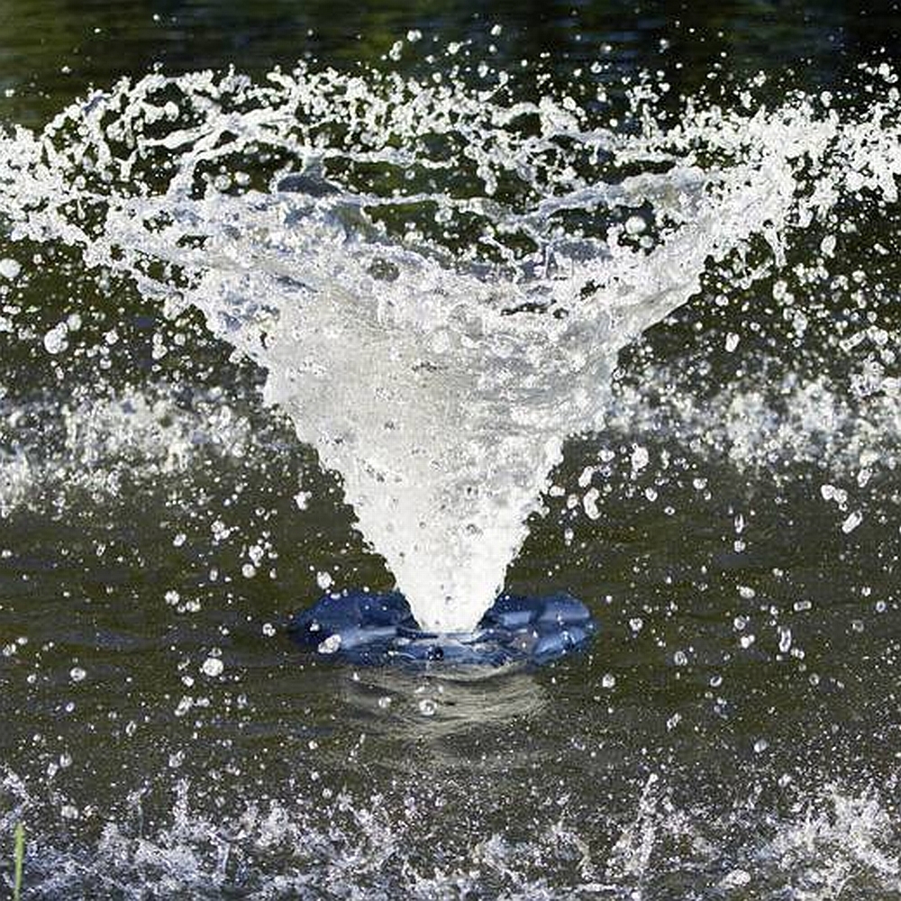 Drijvende vijverbeluchter met krachtige waterspeling en inschakelbare LED-verlichting. De pompmotor kan worden geregeld van 0 tot 100%.