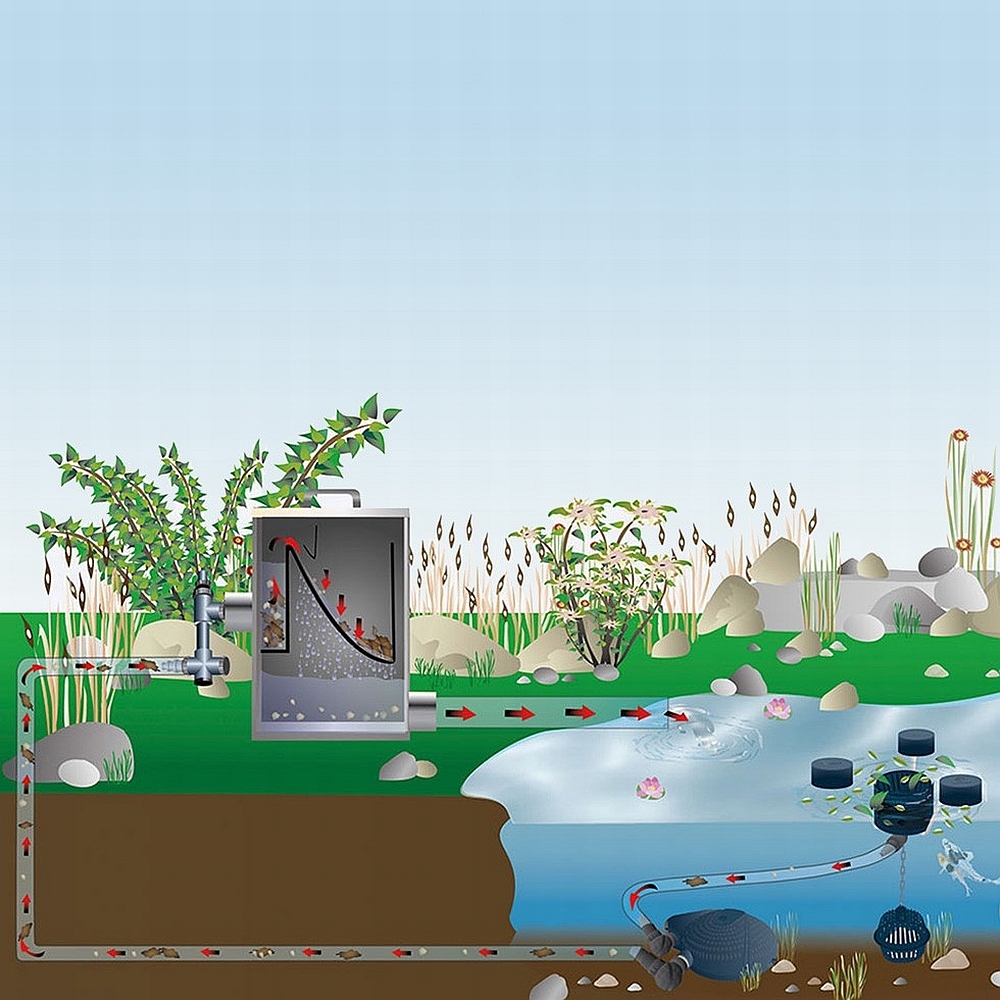 Zeer eenvoudig in gebruik: een dompelpomp wordt in de vijver geplaatst. De pomp wordt met een slang aan het zeeffilter aangesloten. Het water valt door de zeef en het vuil dat groter is dan 0,30 mm blijft op de zeef achter.