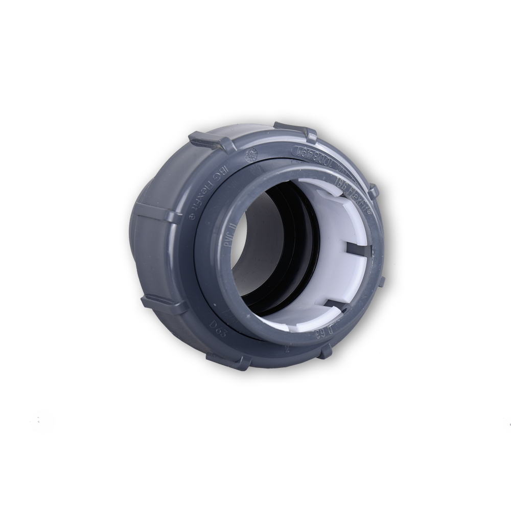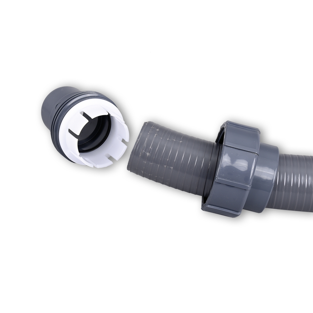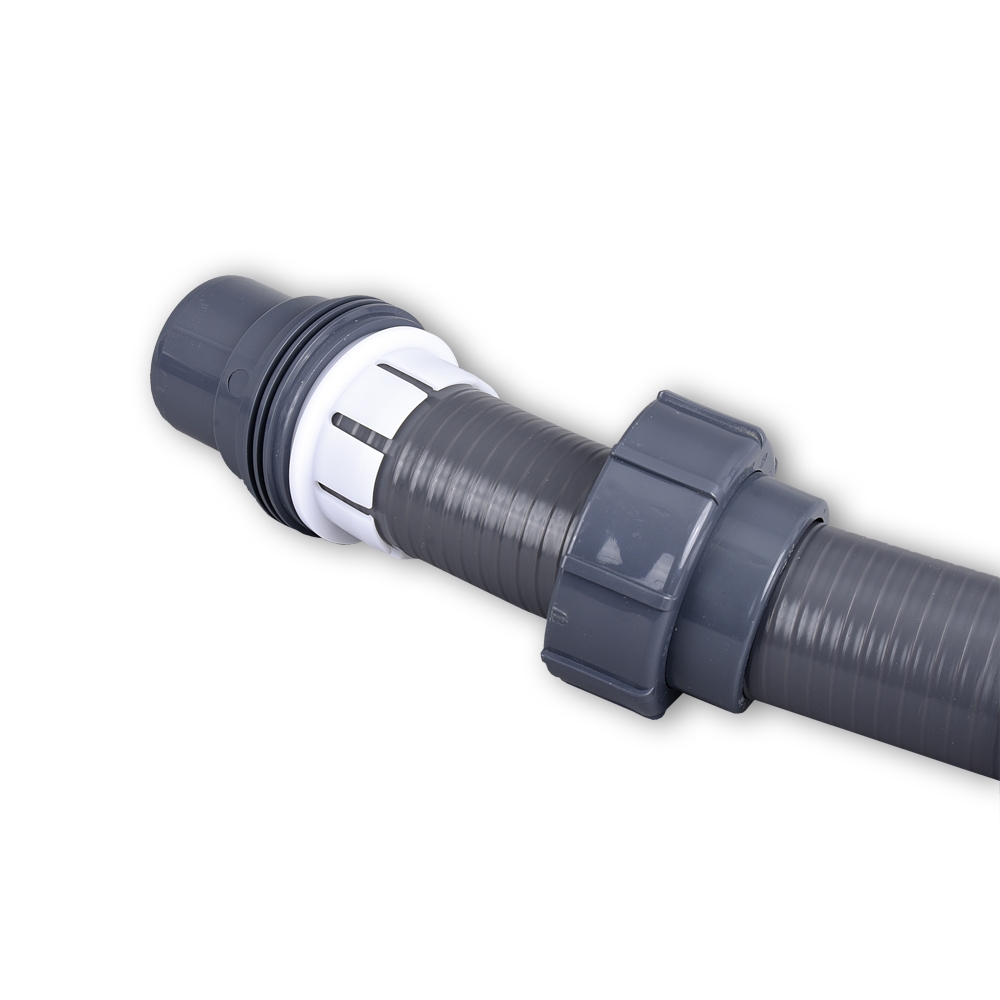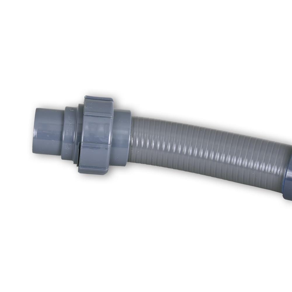 De grijze flexibele slang kan met deze koppelingen worden verbonden. Zo kan een overgang naar de leidingen worden gemaakt.