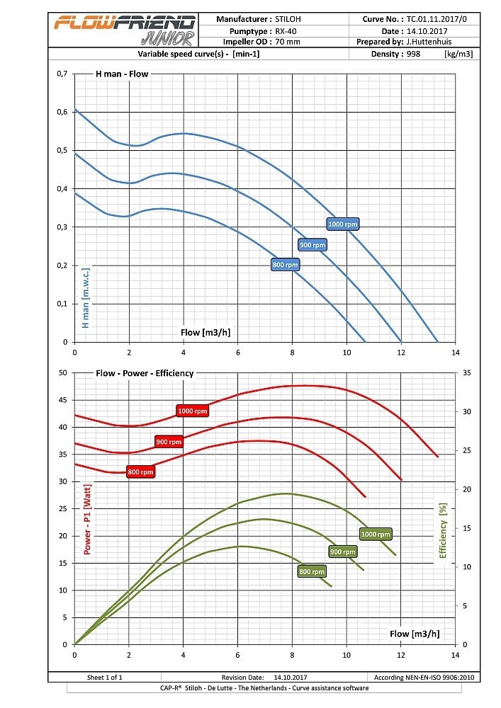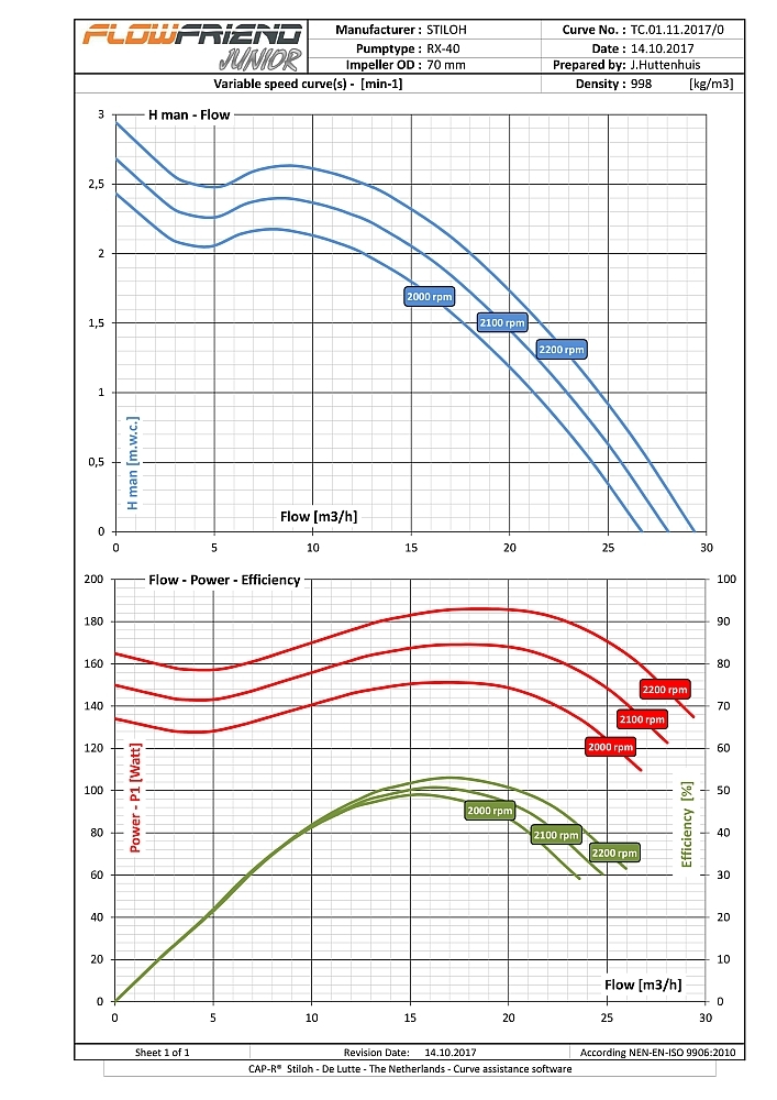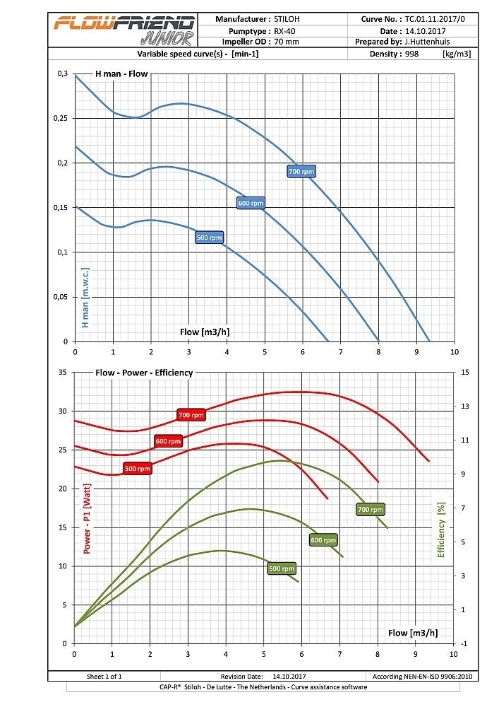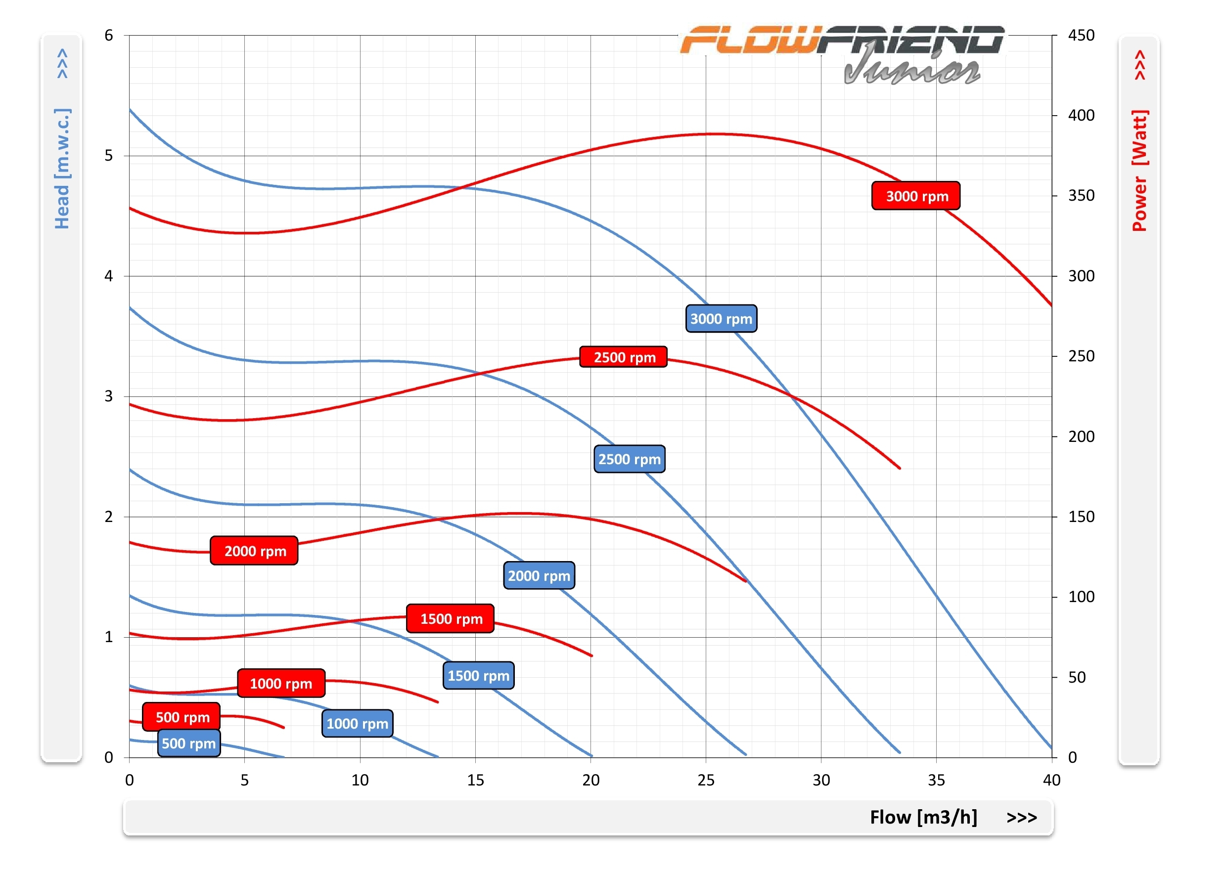 De FlowFriend Junior heeft een van de pomp gescheiden besturingselektronica en is gebouwd voor lagere eisen. Hij pompt tot 40 m3/uur en heeft een maximale druk van 7 m WS.
