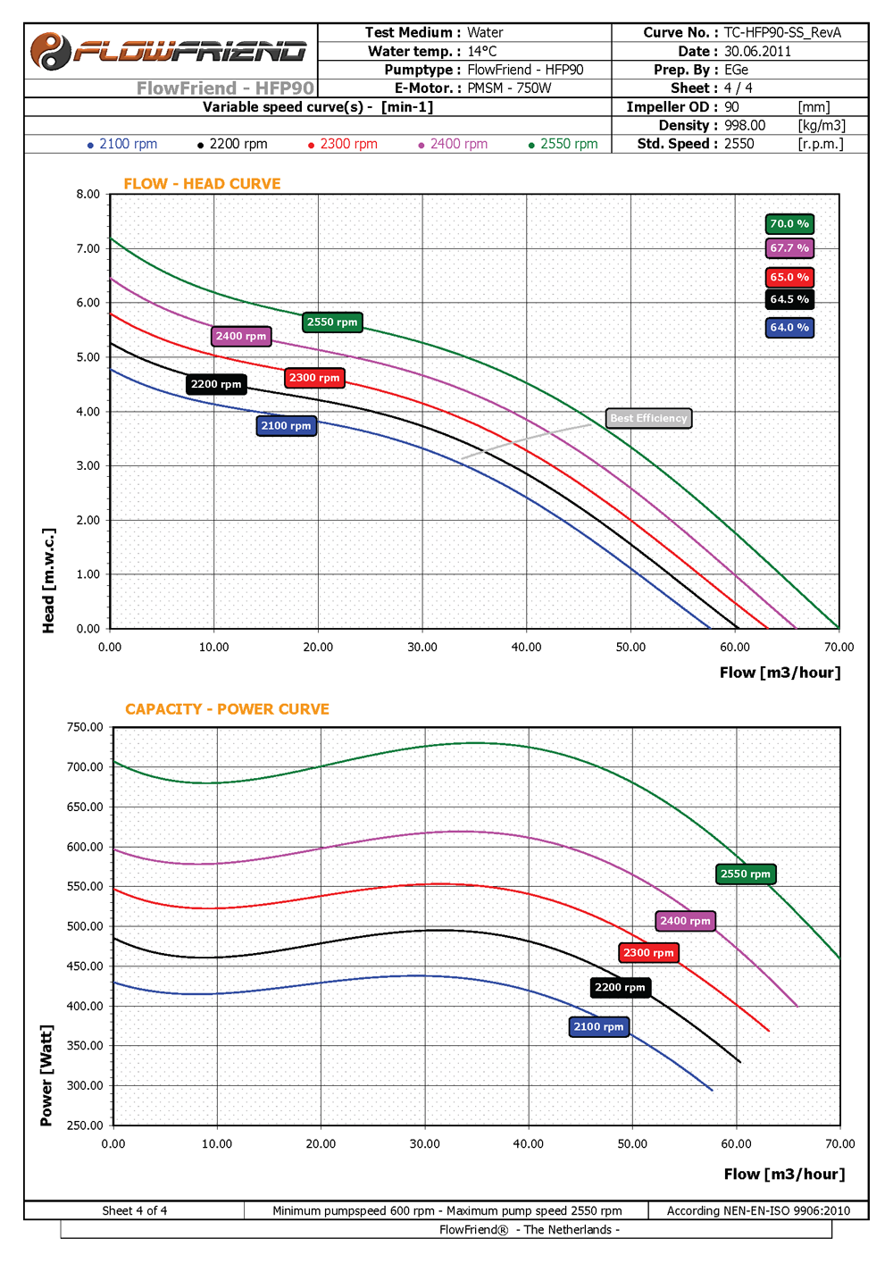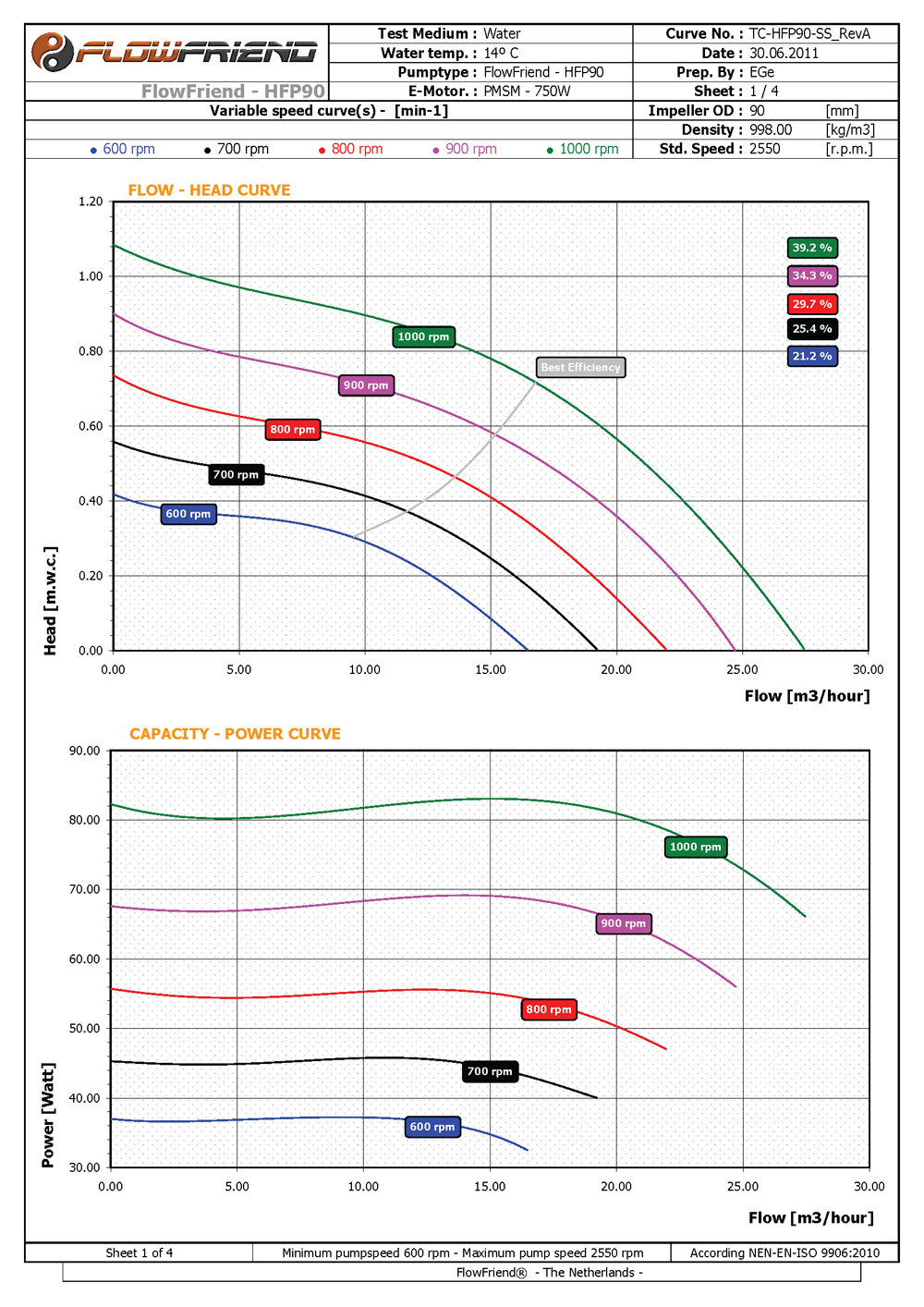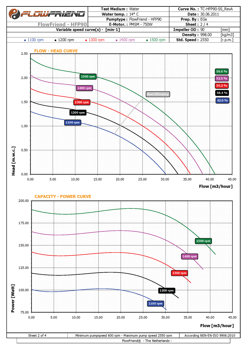 De conclusie over de pomp kan het beste worden weergegeven in een pomptabel. De pomp is getest in een testopstelling volgens de volgende norm: NEN-EN-ISO 9906. De pomp voldoet aan de Europese richtlijn 2009/125/EU (eisen voor het milieuvriendelijk ontwerp van energieverbruikende producten). Zie onder: Technische gegevens