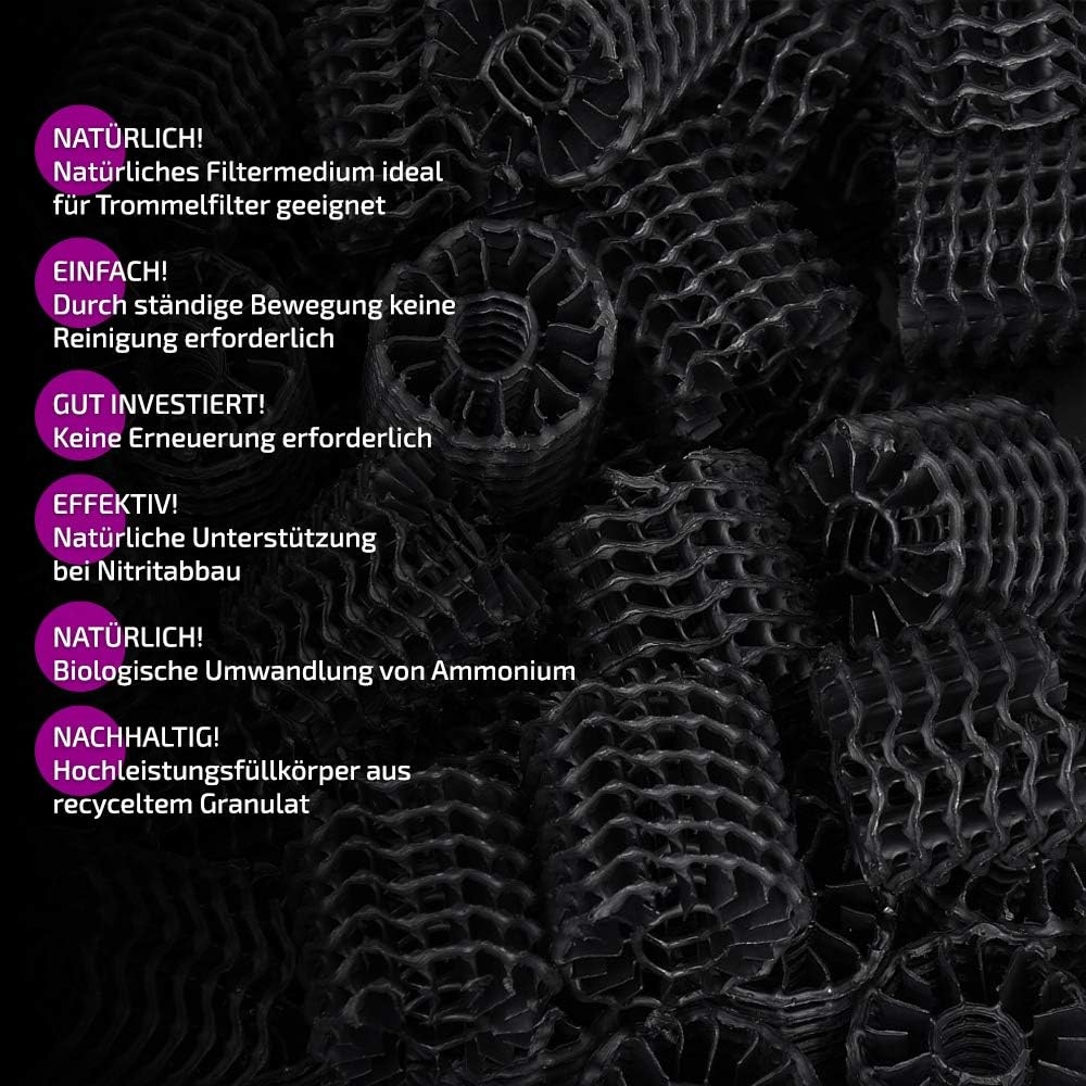 Het Hel-X® H2X36 filtermedium zorgt voor een goede waterkwaliteit in uw vijver met een zo hoog mogelijke afbraakcapaciteit bij de nitrificatie. Het Hel-X® H2X36 filtermedium is dan ook zeer geschikt voor de afbraak van ammonium en nitriet in de laatste filterkamer (helder water). Verder kan het Hel-X® H2X36 vijverfiltermateriaal worden gebruikt voor biologische afvalwaterzuivering.