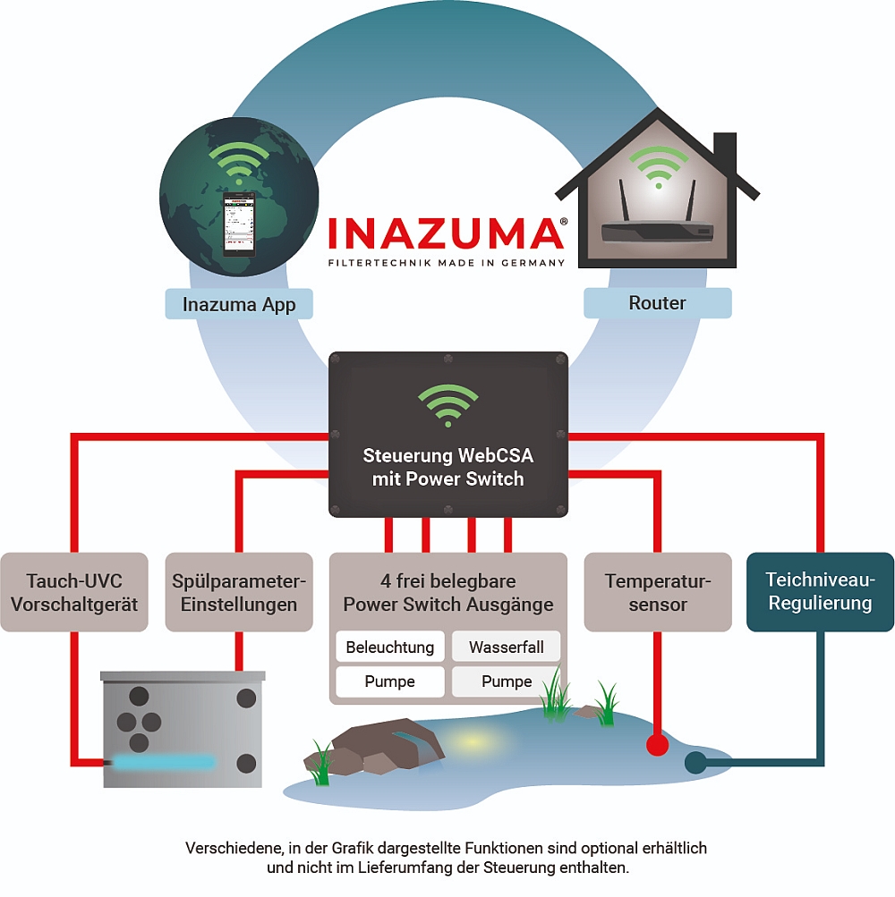 - een vijverniveauregeling (bestaande uit magneetventiel en waterstandssensor met 10 meter kabel) Aansluitklaar met stekker voor WebCSA