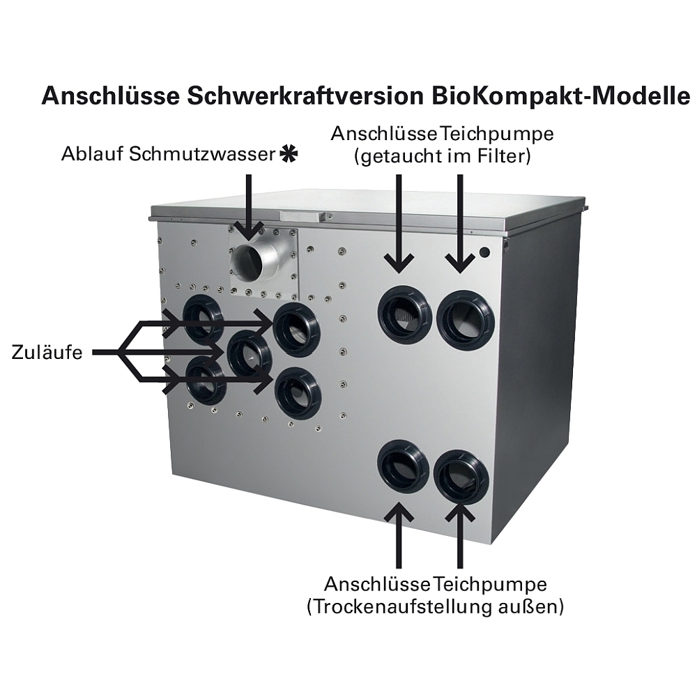 Biokompactmodellen hebben een geïntegreerde biokamer, zodat ze een compleet, ruimtebesparend systeem met geïntegreerde biologische fase vormen – vooral bij nieuwe installaties van een filtersysteem een groot voordeel. Een aansluiting voor een luchtslang voor het beluchten van de biologie is inbegrepen.
