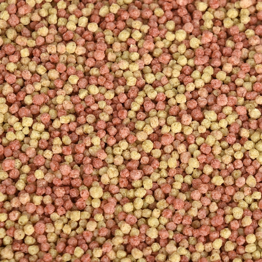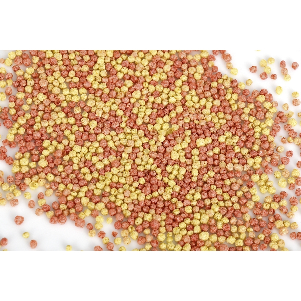 Samenstelling: maïsmeel, tarwemeel 30%, rijstmeel, zalmmeel, sojameel, tarwekiemmeel 6%, garnalenmeel 2%, spinaziemeel 2%