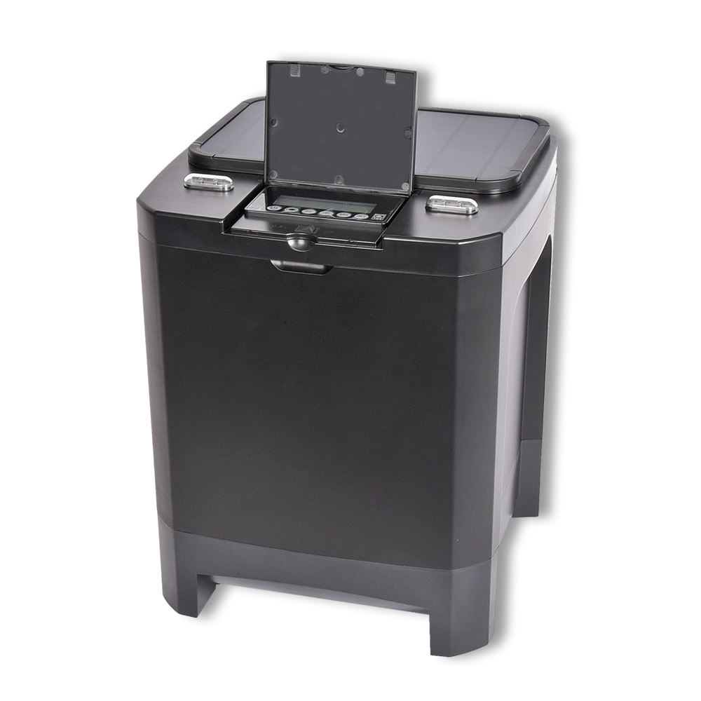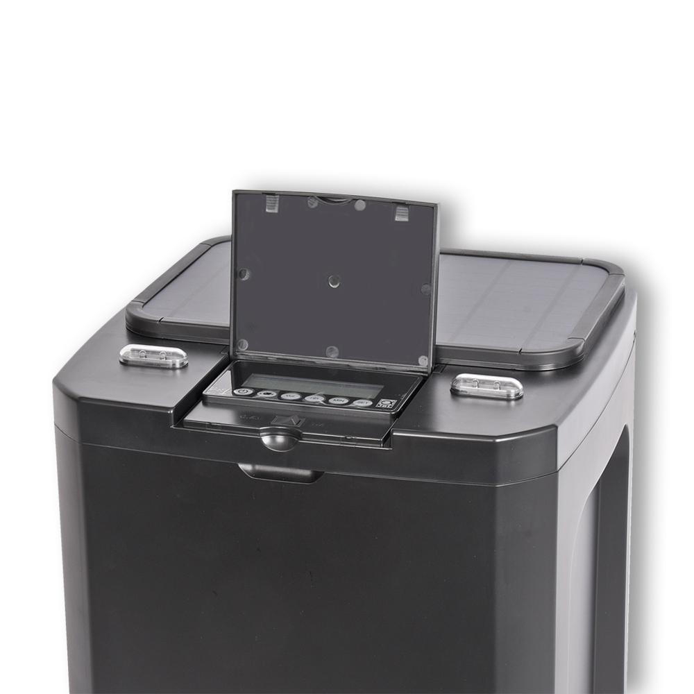 De automaat kan worden gebruikt met een 5 meter lange netsnoer of met het geïntegreerde zonnepaneel met Li-ion-accu (7200 mAh).