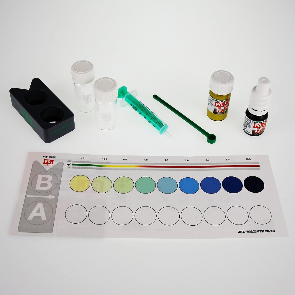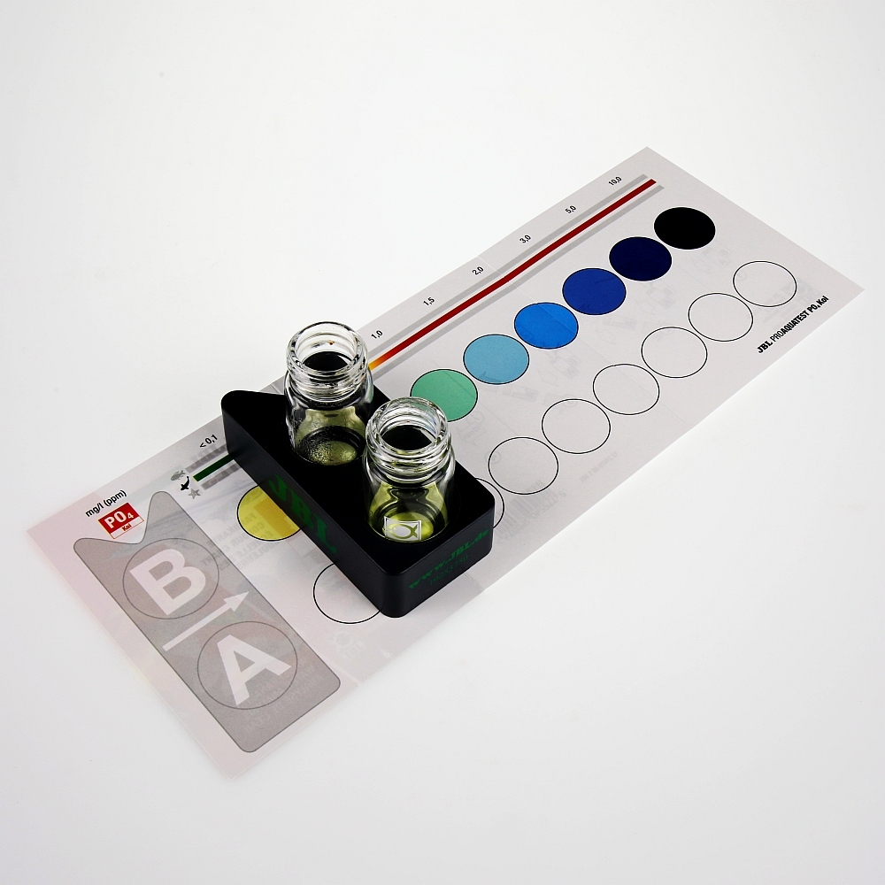 Inhoud: sneltest, fosfaattest PO4, incl. reagentia, glazen cuvetten met schroefdop, spuit, doseerlepel, comparatorblok en kleurenschaal.