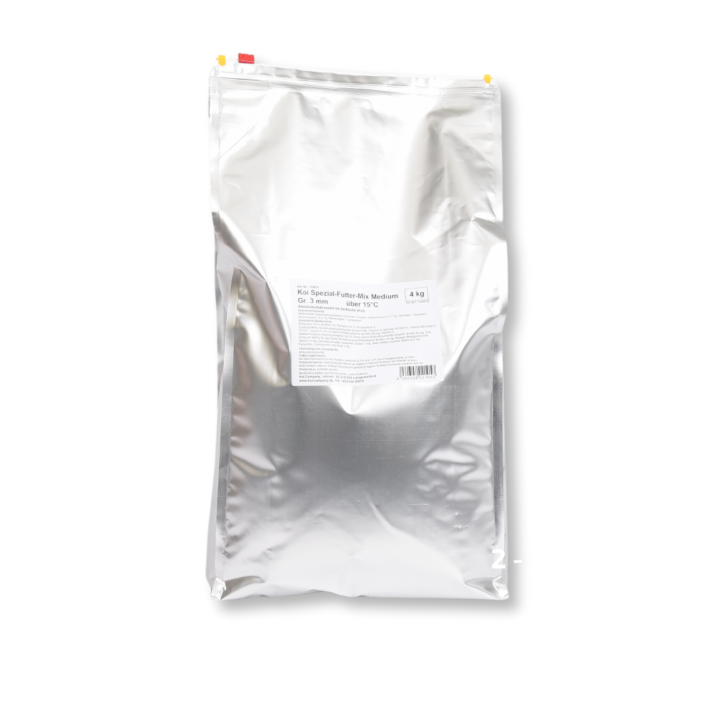 Vanwege ons hoge verbruik ontvangt u onze Koi Spezial Futtermix Medium altijd absoluut vers.