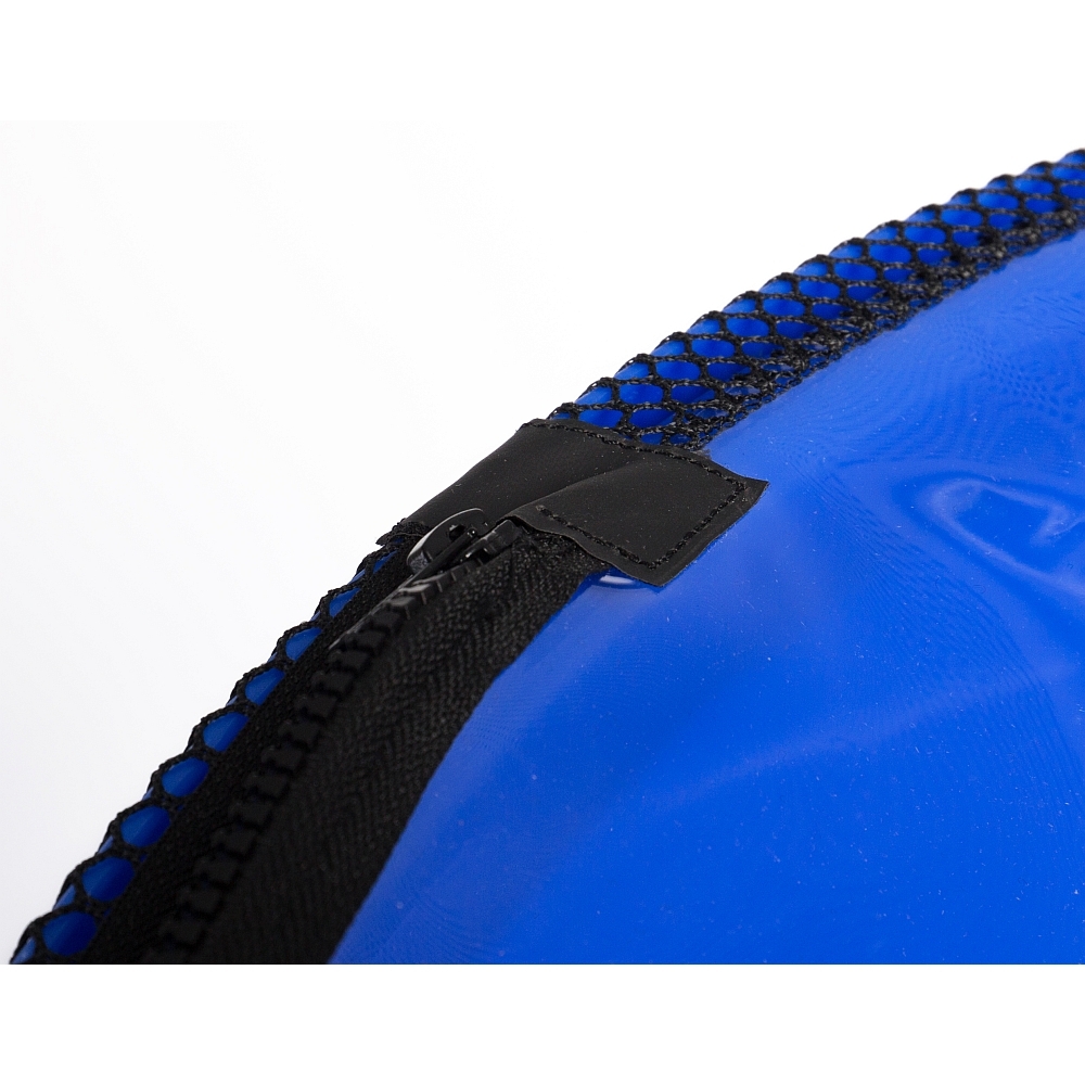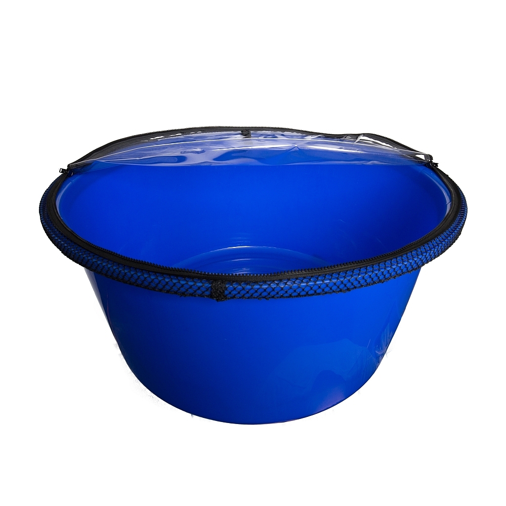 Aan de rand wordt de afdekking vastgezet met een net. In dit net is een verstelbare elastische band aangebracht, die de afdekking stevig op zijn plaats houdt. Hoe groot een vis ook is, hij kan de afdekking niet naar beneden trekken. Bij de ronde bak is nog een klittenbandsluiting aangebracht om de omgeslagen folie vast te zetten. Deze afdekking kan ook worden gebruikt voor kortstondig transport, omdat deze het wegstromen van water vermindert.