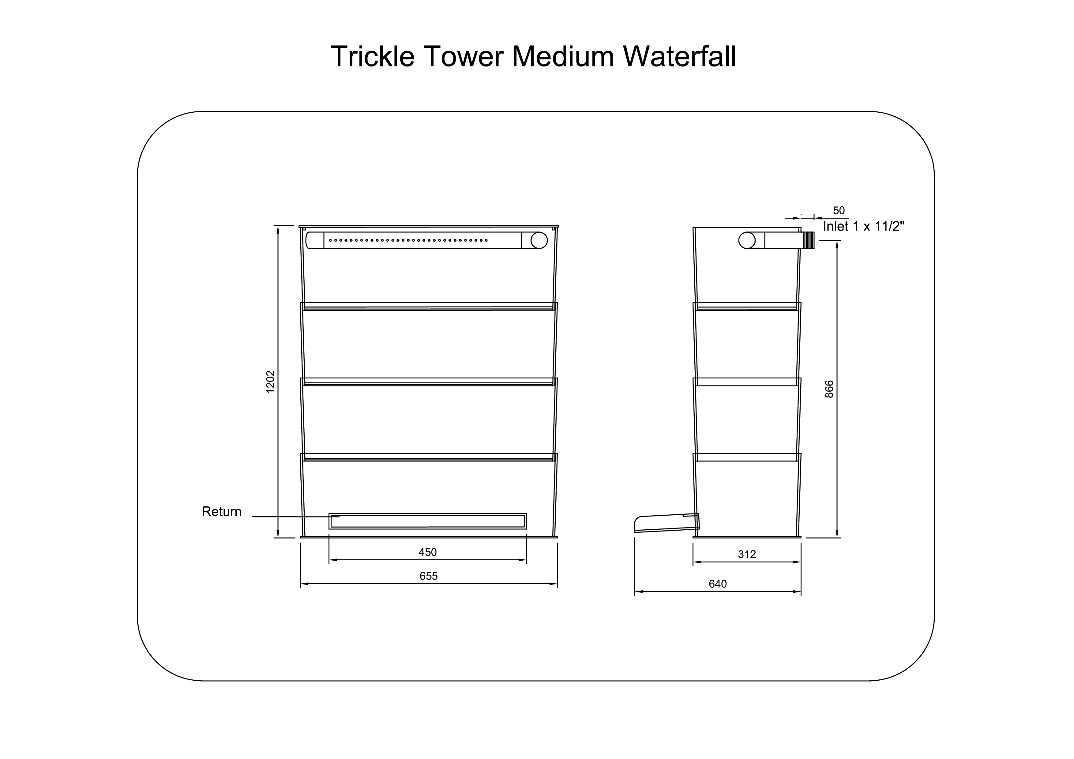 Het water wordt via een sproeibuis Ø 50 mm in de trickle-toren gepompt. Via een geperforeerde bodem stroomt het water door de afzonderlijke kamers terug naar de vijver. Daarbij komen heel veel waterdruppels op de volgende laag terecht, spatten uiteen en zorgen voor een goede zuurstofverrijking.