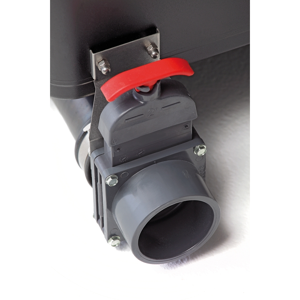 De spoeling gebeurt met gezuiverd vijverwater met een geïntegreerde krachtige drukpomp. Een extra wateraansluiting op het filter is niet nodig.