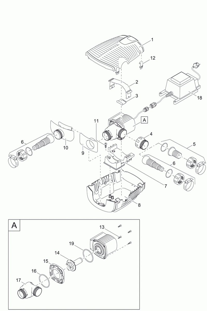 ! Belangrijk: de voeding moet minstens 2 m van de vijver worden geplaatst !