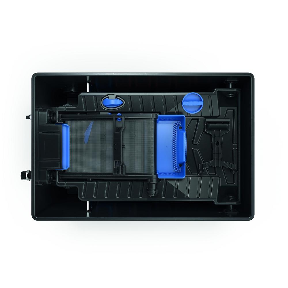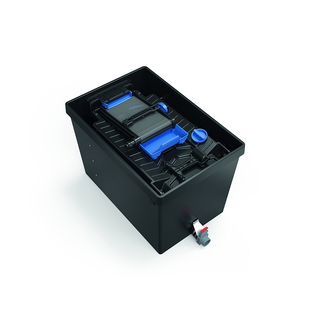 Door de compacte eindloze band aan de ingang van het filter wordt het grove vuil uit de vijver automatisch opgevangen en komt het via de draaiende band in een verwijderbare opvangmand terecht.