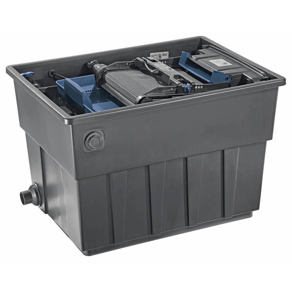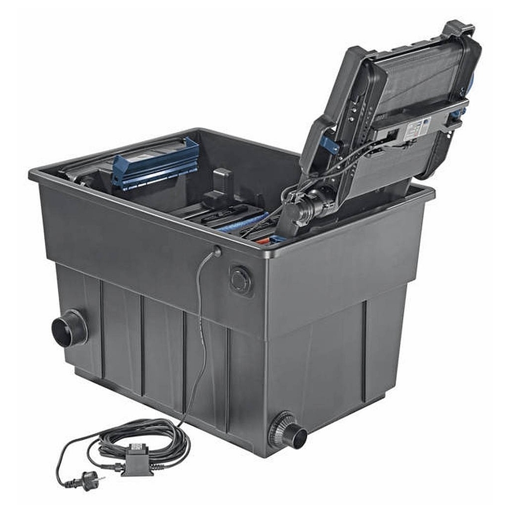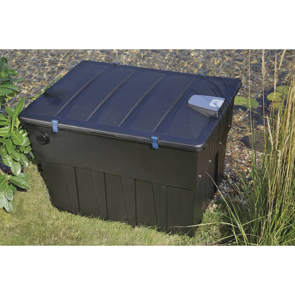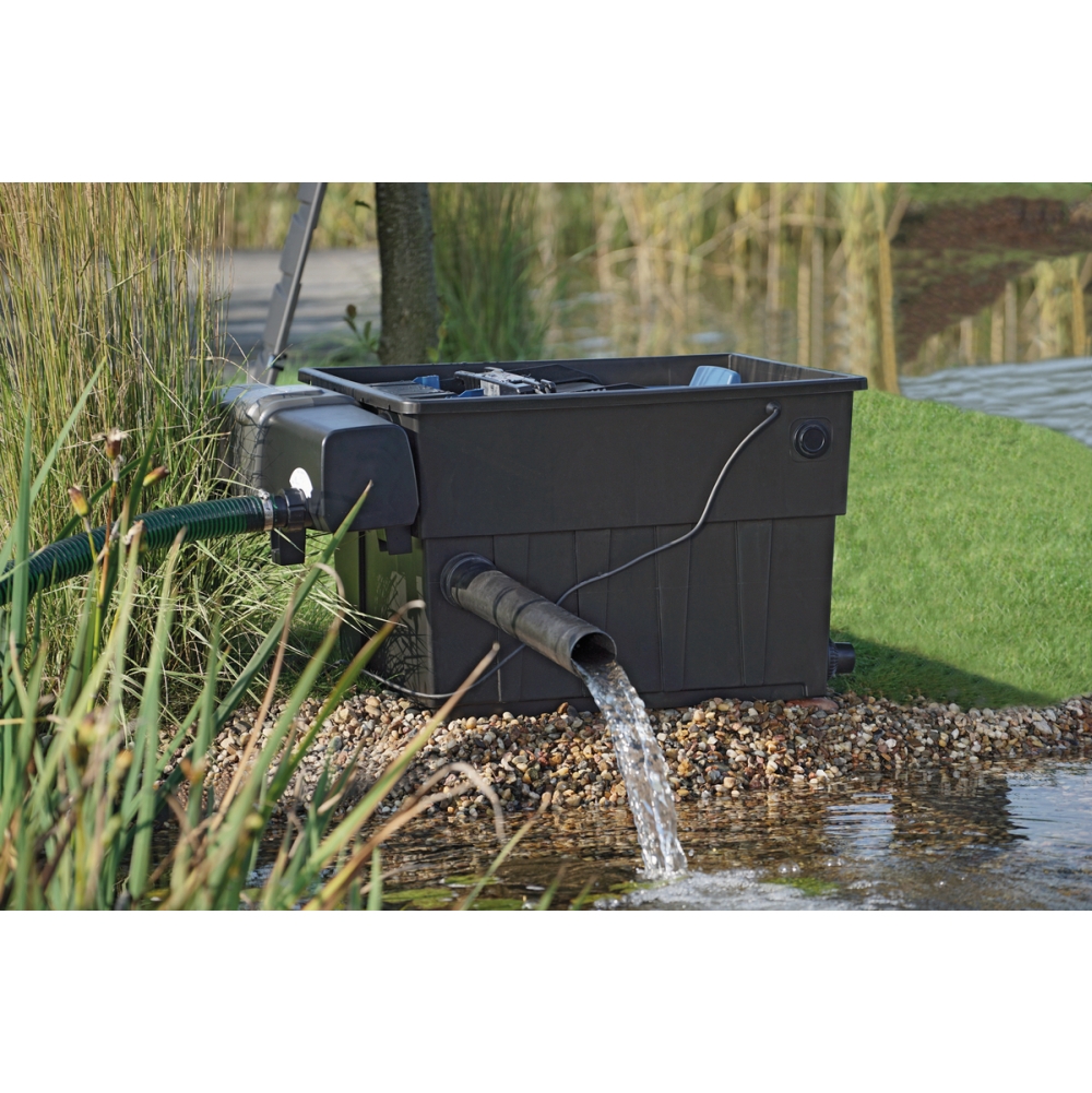 Moderne doorstroomfilter met automatische grove vuilafscheiding voor vijvers tot 10.000 liter.
