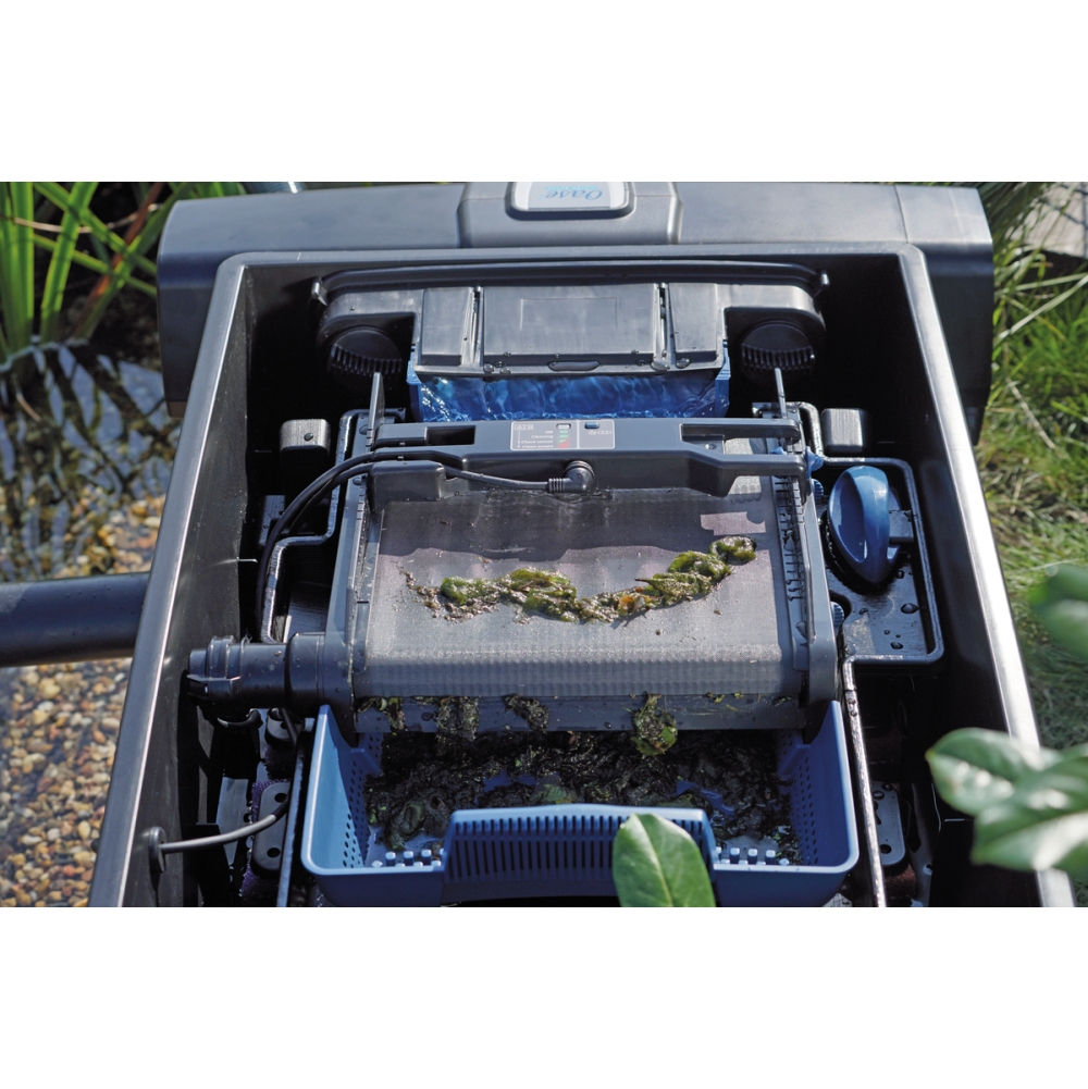 Door de compacte eindloze band aan de ingang van het filter wordt het grove vuil uit de vijver automatisch opgevangen en komt het via de draaiende band in een verwijderbare opvangmand terecht.