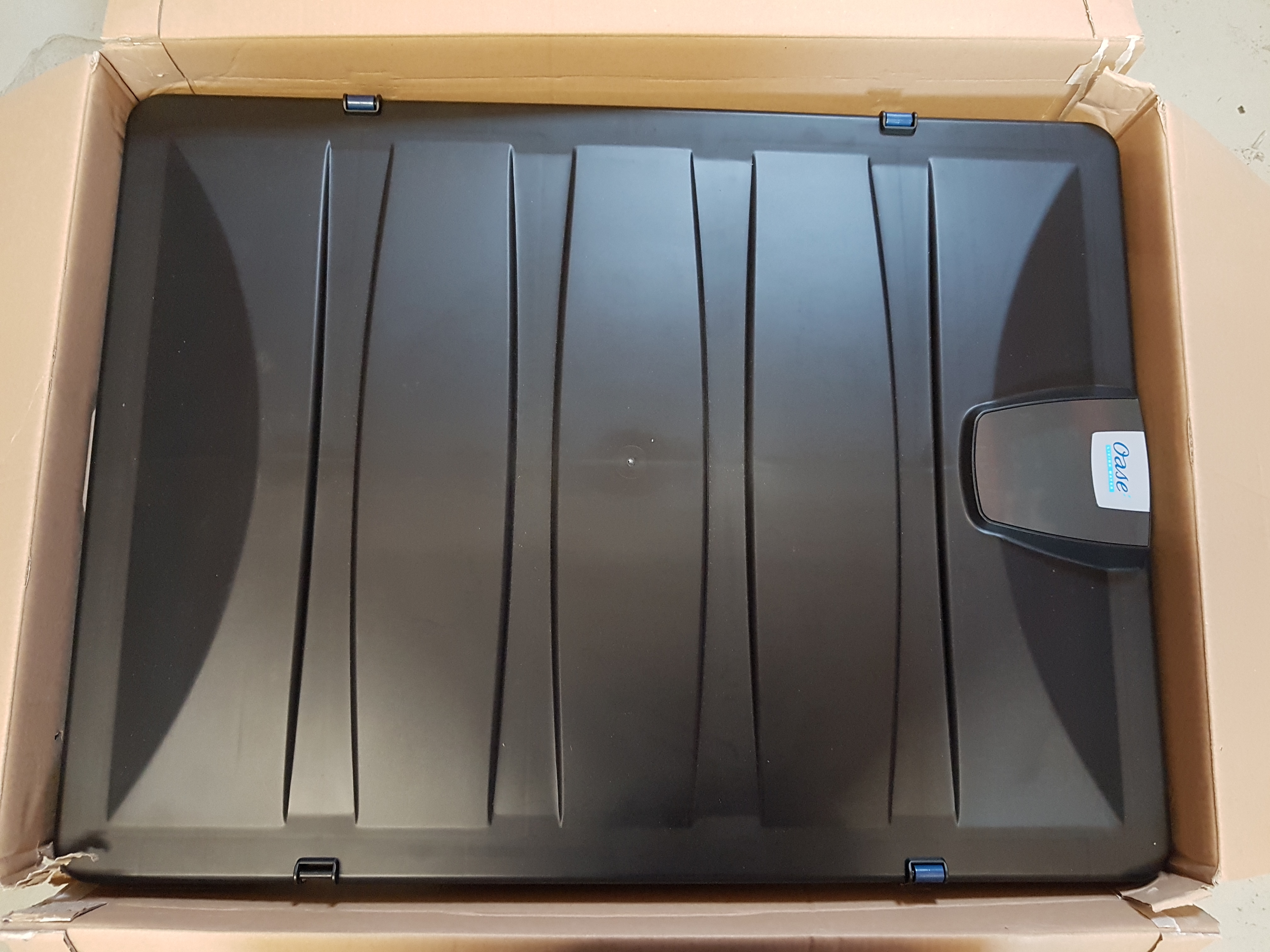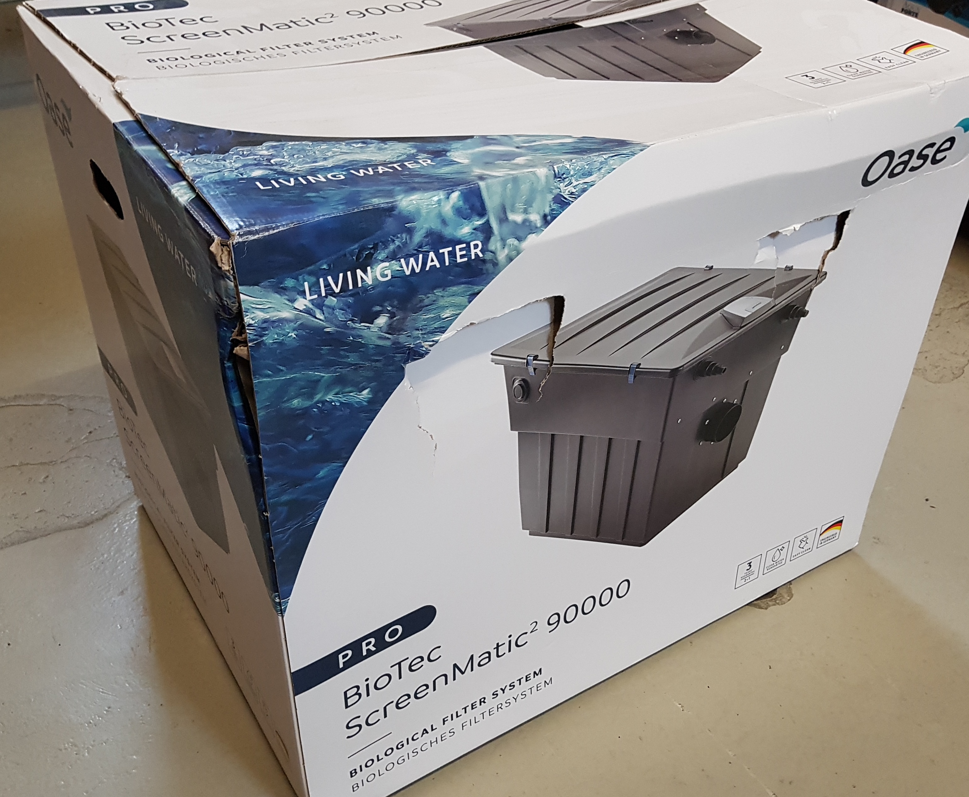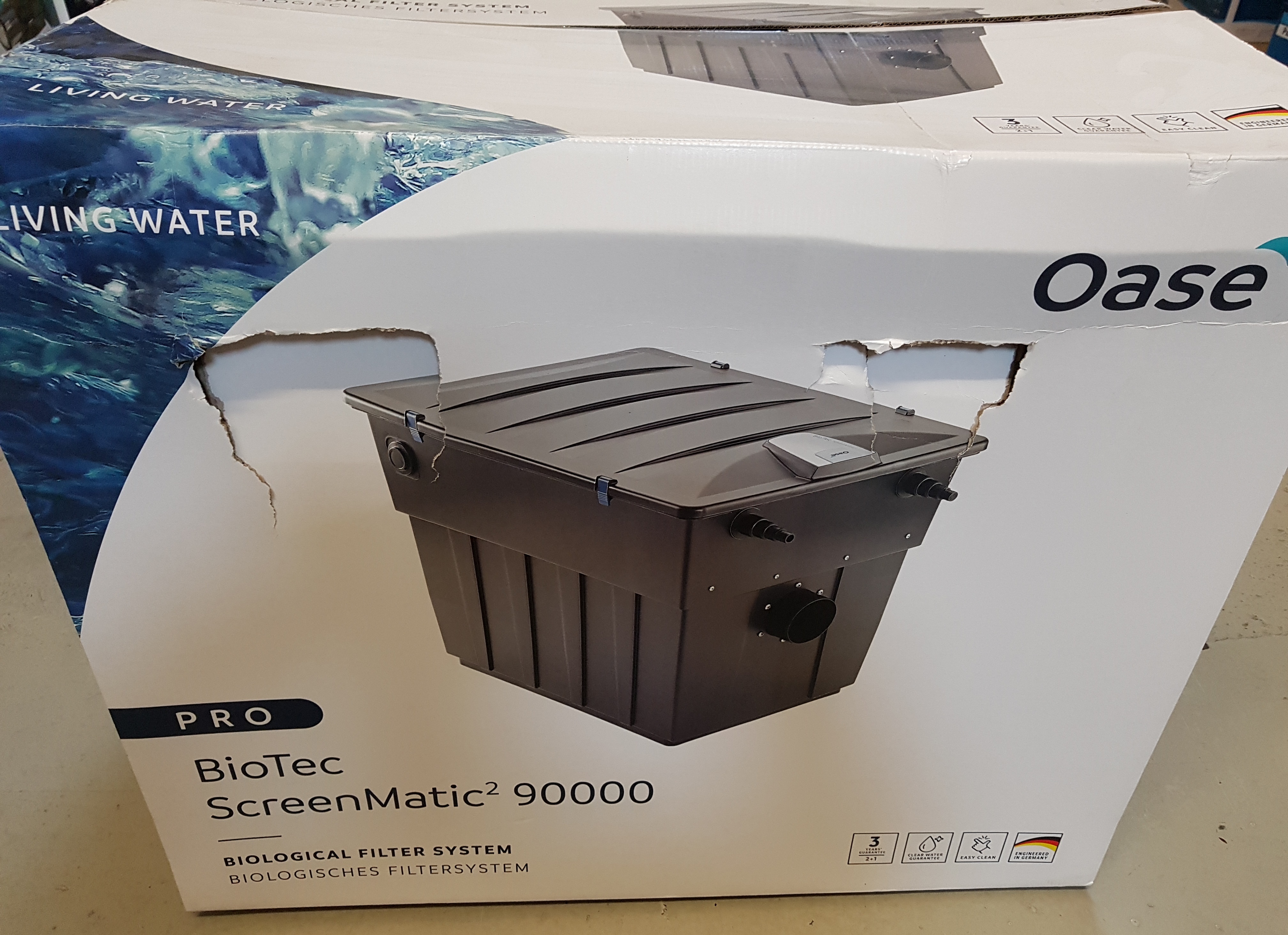 De Oase BioTec Screen Matic² 90000 is zo goed als nieuw, alleen de verpakking is beschadigd en een van de dekselclips ontbreekt. De behuizing is vervangen door een origineel onderdeel.