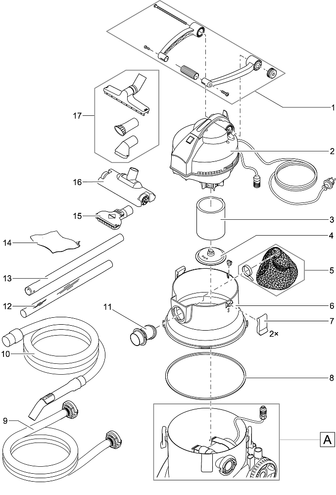 - Inbegrepen in de levering: 4 robuuste aluminium buizen, speciale draadalgenmondstuk, verbreed universeel mondstuk, vlakmondstuk, natzuigborstel, borstelmondstuk, vuilopvangzak, 5 m lange zuigslang en 10 m lange afvoerslang