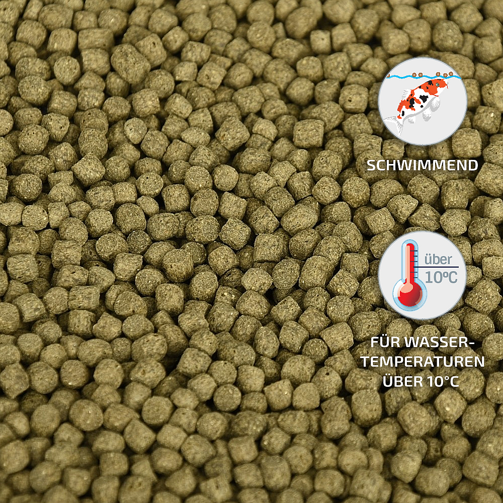Daarom hebben we bij ons nieuwe voer de nadruk gelegd op de voeracceptatie van de koi. Uitgebreide tests hebben aangetoond dat eigenlijk elke koi van dit voer houdt. Het voer valt op door zijn ingrediënten. Dankzij de hoge kwaliteit is verkleuring van het water geen probleem meer. De verwerking is technisch zeer innovatief, wat te zien is aan de perfect gevormde pellets.