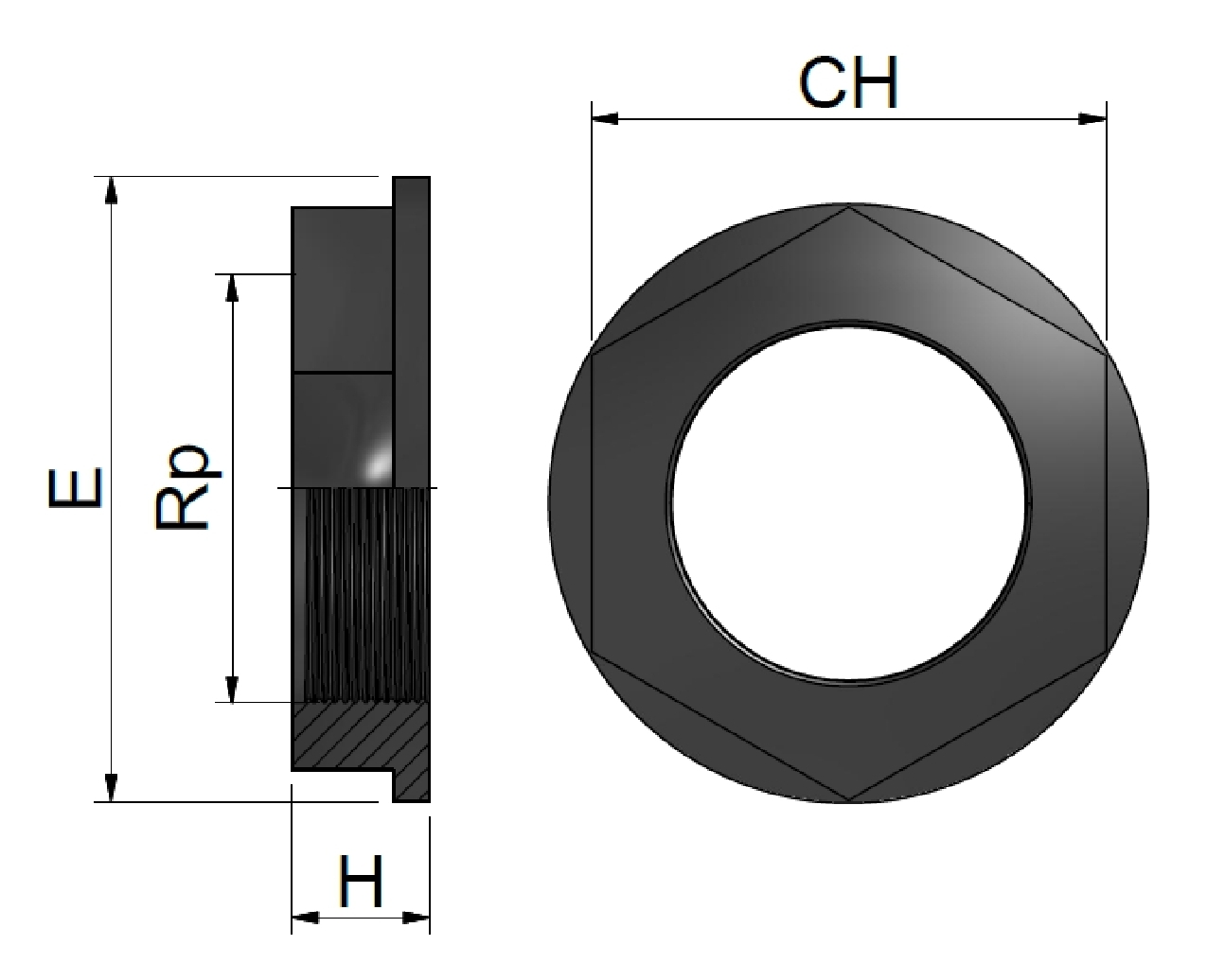 | (Rp) Binnendiameter | (E) Buitendiameter | H | CH | Gewicht |