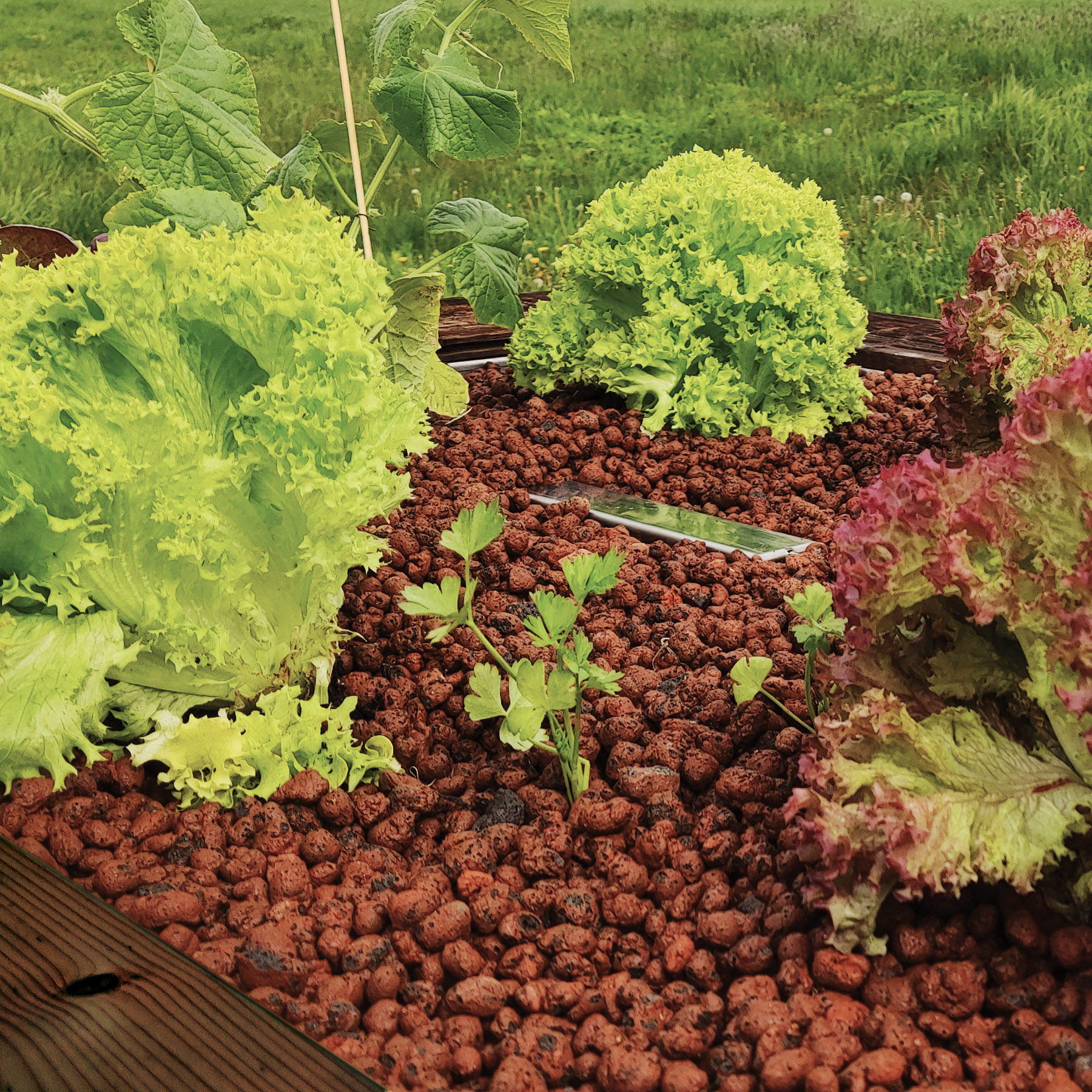 Die im Substrat gepflanzten Salate, Kräuter oder Zierpflanzen werden stets optimal mit Wasser versorgt, die im Teich vorhandenen Nährstoffe dienen als Naturdünger für Ihre Pflanzen. Durch eine Öffnung kann ein Luftschlauch zum Belüften installiert werden.