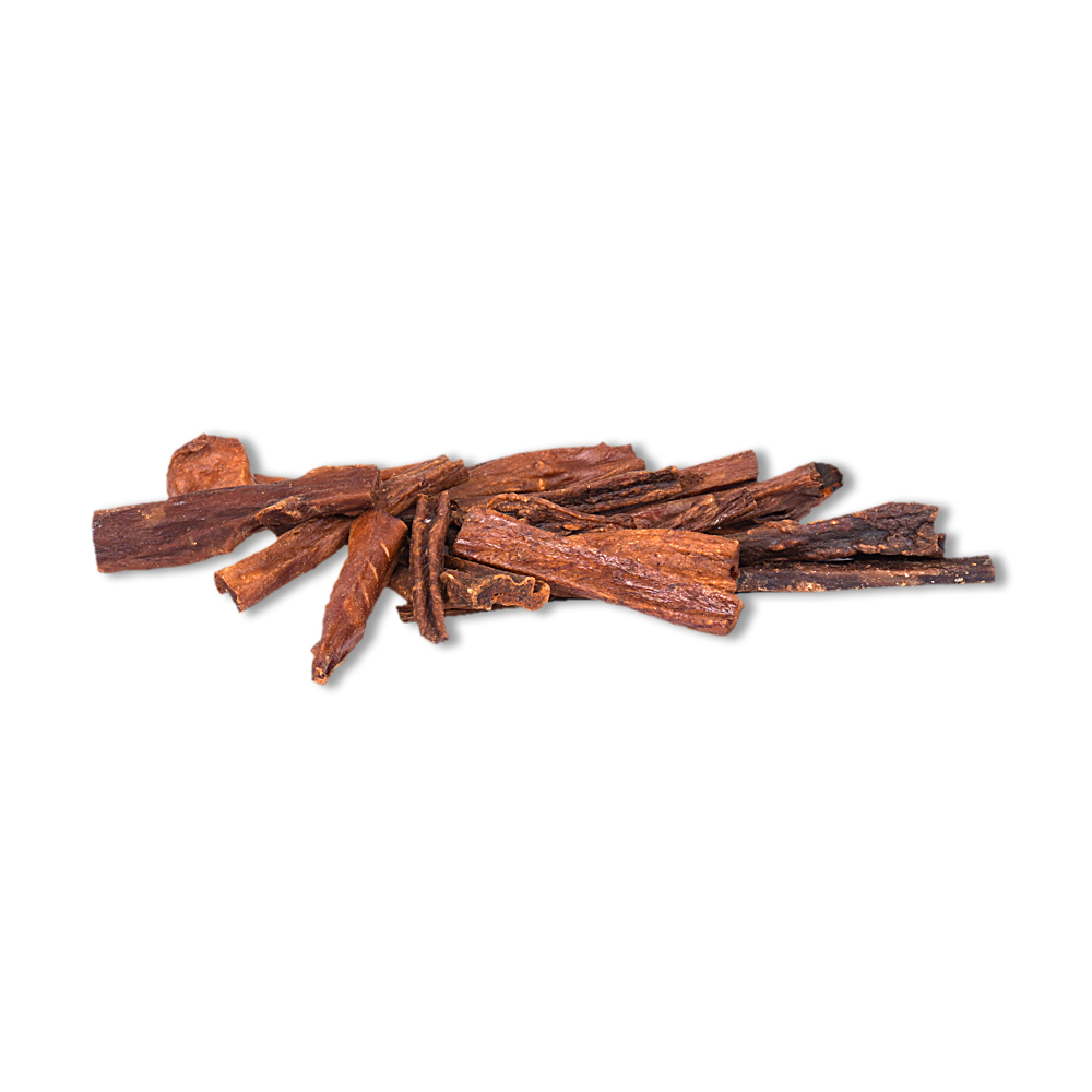 Simmental-vleessnacks worden gedroogd boven een beukenhoutvuur, waardoor ze een fijne rooksmaak krijgen.