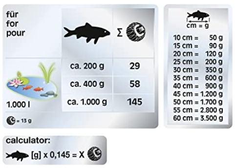 De dosering is afhankelijk van de aanwezige visstand. Per 1.000 gram vis zijn 145 balletjes nodig. Bij een matig bevolkte vijver met ca. 200 g vis en een maximale visstand van 1.000 g vis per 1.000 liter vijvervolume, heeft een verpakking van 10 liter met 210 balletjes een bereik van 1.500 tot 7.300 liter en bij een verpakking van 50 liter met 1.050 balletjes een bereik van 7.350 tot 37.000 liter.