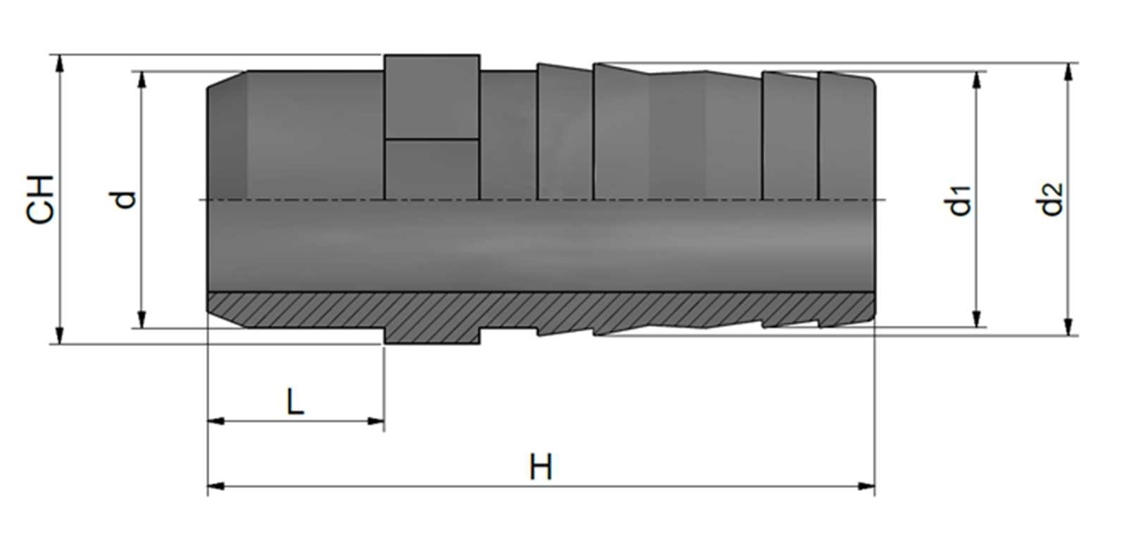 (d) Diameter links (d1) Diameter (grootste) rechts (d2) Diameter rechts (L) Lengte lijmverbinding (H) Totale lengte (CH) Diameter (grootste) links Gewicht