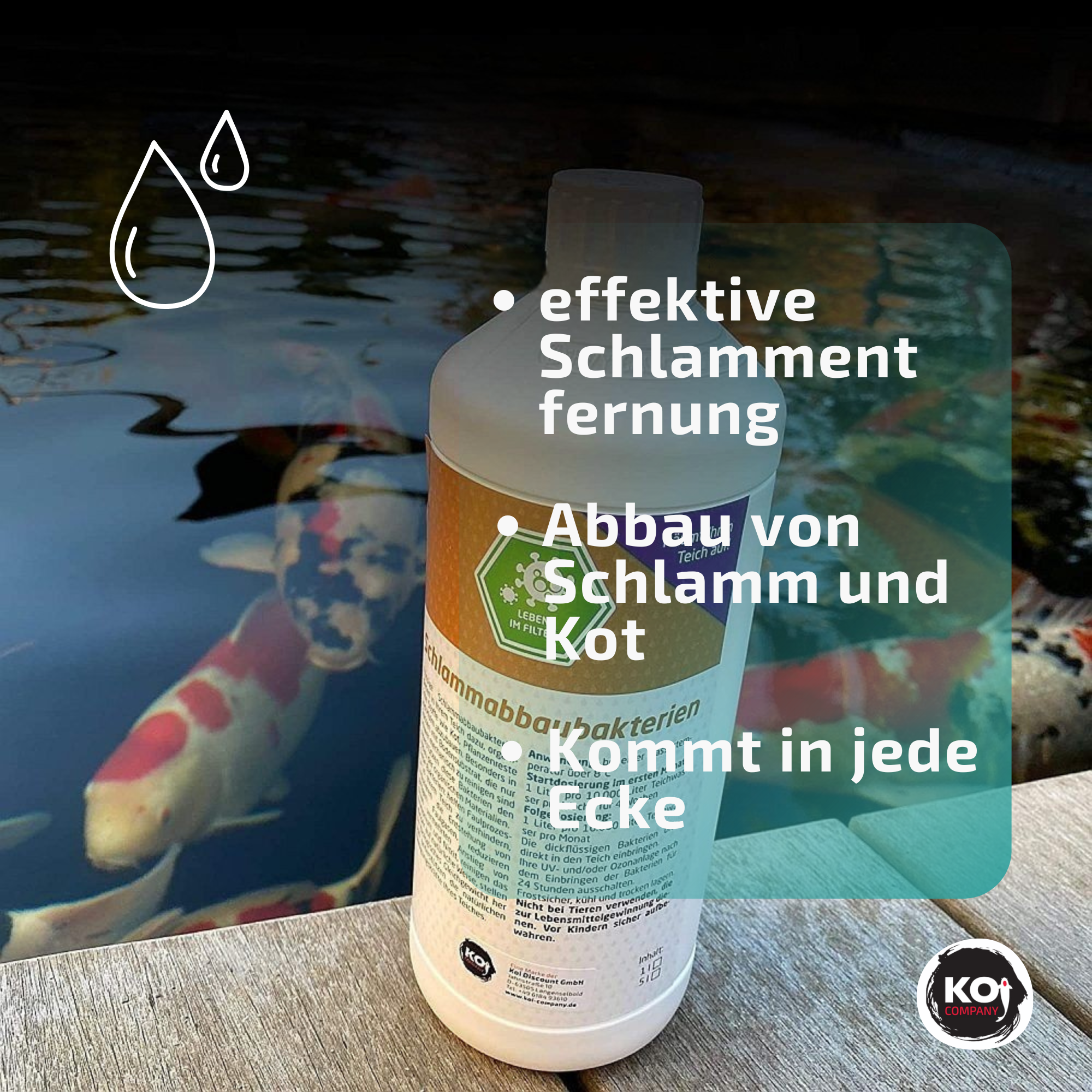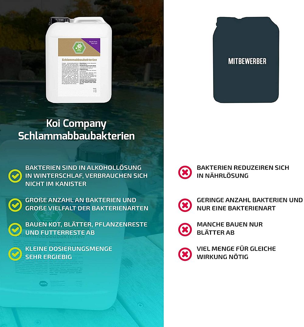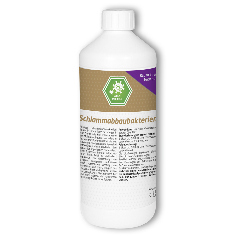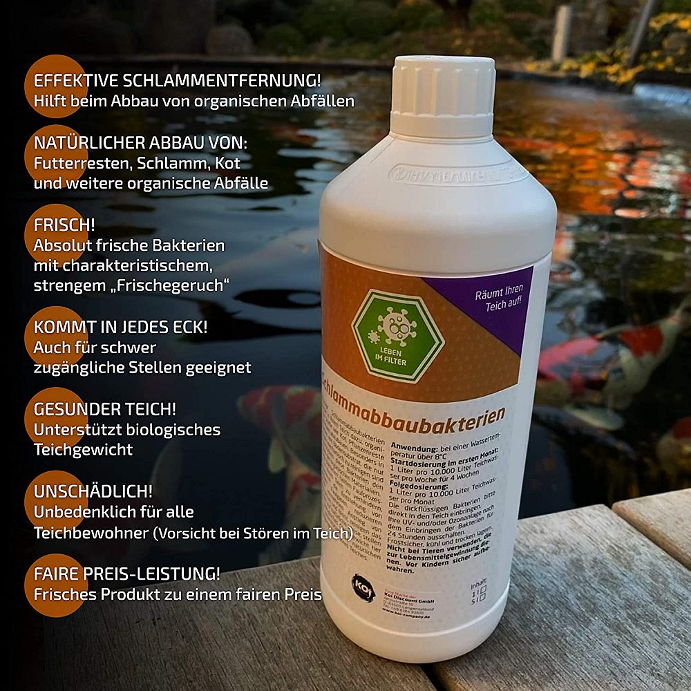Restanten van uitwerpselen, voer en organisch afval horen niet in de vijver thuis. Wij hebben voor Koi Company deze slibafbrekende bacteriën laten produceren. Deze ondersteunen het biologische evenwicht en zorgen ervoor dat slib en organische resten ook op moeilijk bereikbare plaatsen worden afgebroken.