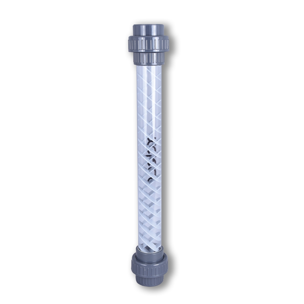 De statische menger mengt lucht met waterstroming. De PVC-vleugels zorgen ervoor dat het water roteert, waardoor de luchtbellen en het water nog
