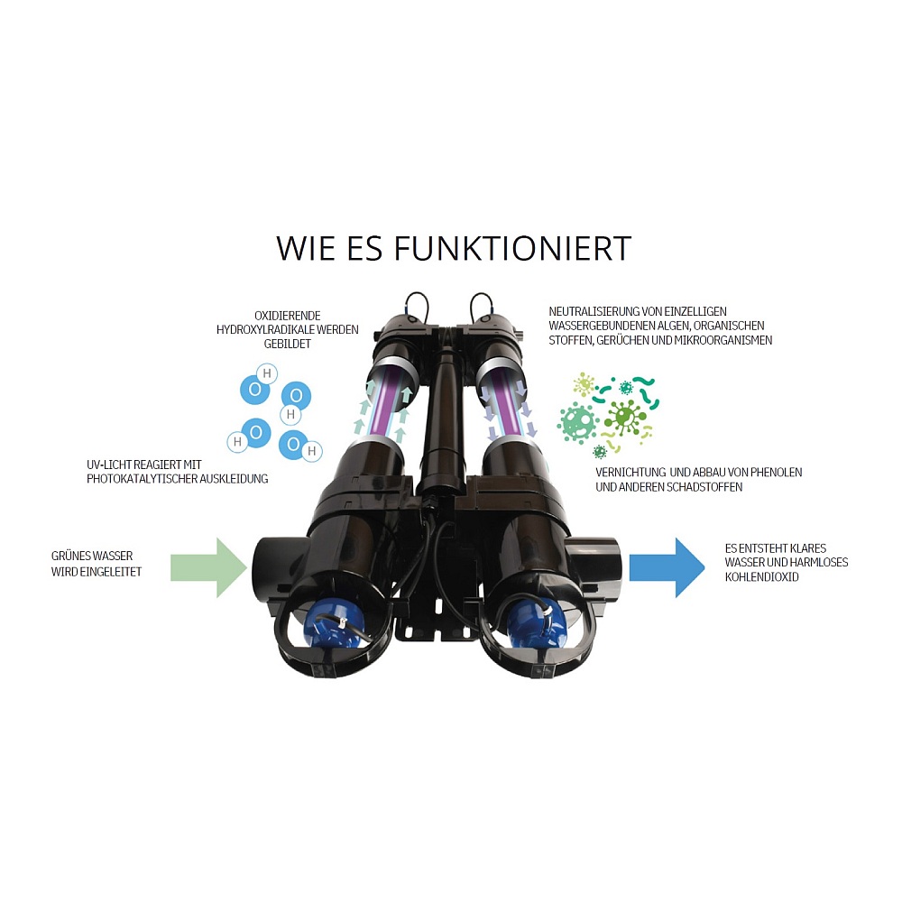 - De ontstane hydroxylradicalen werken als ozon en maken het water nog helderder.
