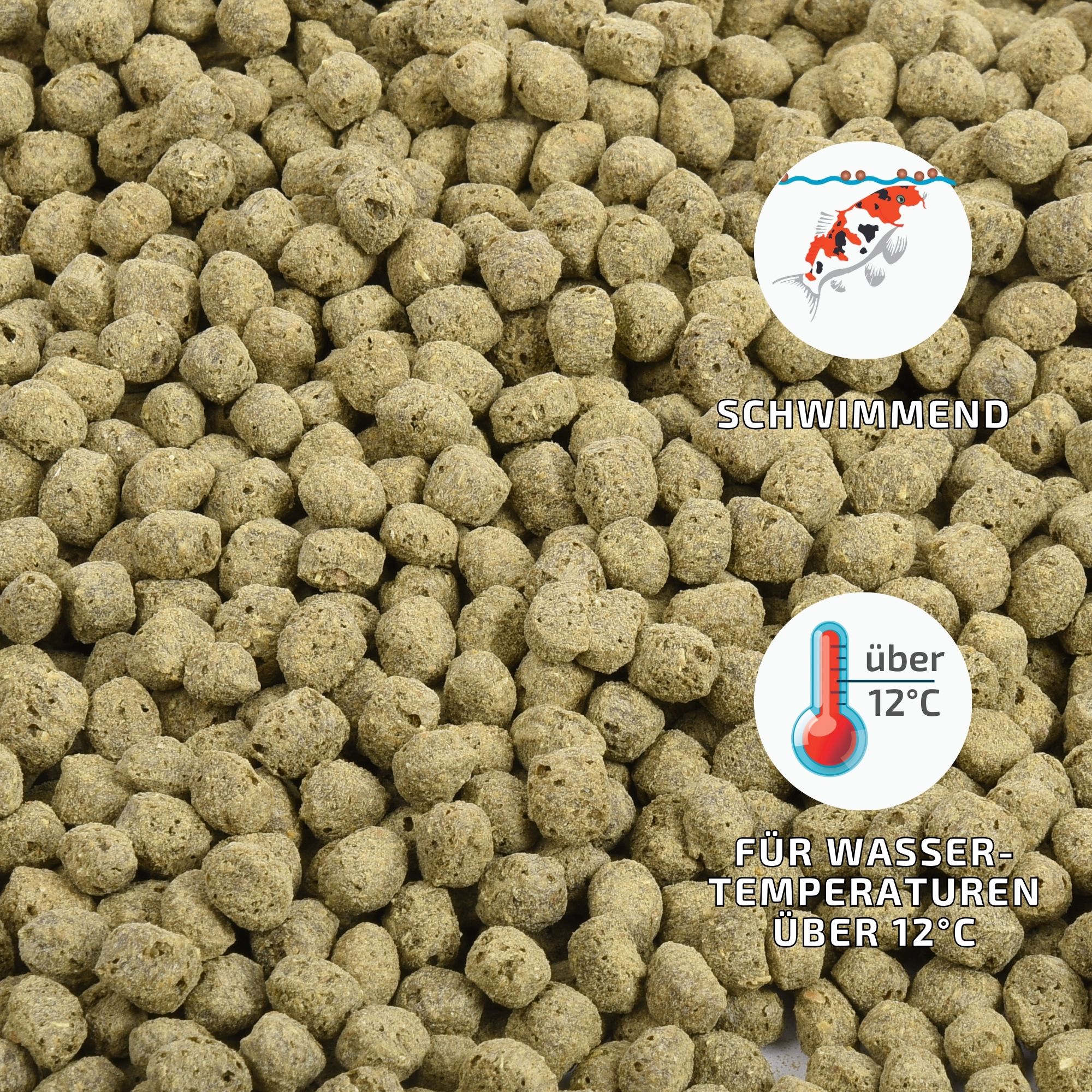 Voer uw koi 1-3 keer per dag, afhankelijk van de watertemperatuur. Als volledig voer voor koikarpers, tussen 0,2% en 1,5% van het visgewicht, afhankelijk van de watertemperatuur en het seizoen.