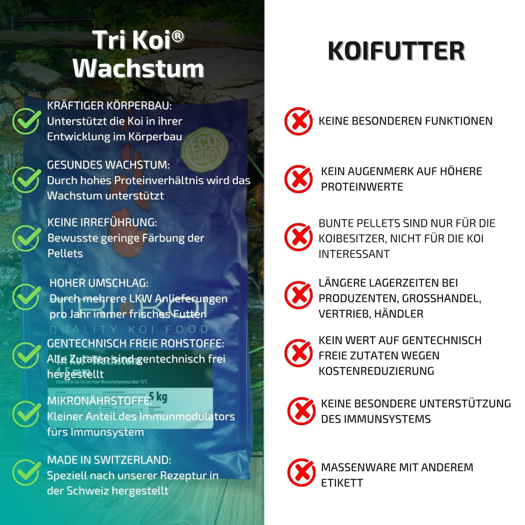 Ze produceren voor ons visvoer dat speciaal is afgestemd op koi en dat het exclusieve micronutriëntencomplex AQUACULTURE GUARD® bevat. Deze stof zit in al onze voersoorten van Hokovit en bevat meer dan 60 verschillende kruiden- en plantenextracten die perfect op elkaar zijn afgestemd. Zo is onze Tri Koi® Standard-voerserie ontstaan. Wij zijn ervan overtuigd dat de kwaliteit uw koi zal bekoren. Dat de kwaliteit enerzijds zeer hoog is en anderzijds de prijs-kwaliteitverhouding toch klopt, is te danken aan het bedrijf Hokovit. Schenk ons uw vertrouwen in onze beslissing. U zult, net als wij, enthousiast zijn over de kwaliteit. Wij hebben de kwaliteitsnorm met dit koivoer extreem verhoogd. U zult het onmiddellijk zien aan het gedrag van uw koi.