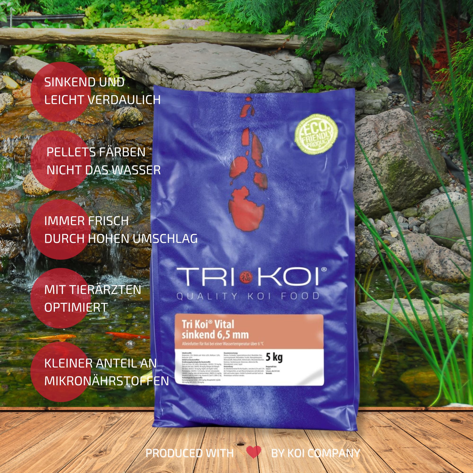 Doe een test: open een zak Tri Koi® en ruik eens – u zult het verschil 'ruiken'! Door de hoge kwaliteit van het voer kunt u de hoeveelheid voer merkbaar verminderen. We zien bewust af van grote aquacultuurbedrijven als fabrikant en laten het koivoer door een gespecialiseerde leverancier produceren. Veiligheid bij de productie en optimale beschikbaarheid zijn één reden, een andere is de kwaliteit, waarvan we ons uitgebreid hebben kunnen overtuigen. De ingrediënten zijn samengesteld volgens de nieuwste inzichten. Hiervoor heeft de fabrikant overleg gepleegd met gerenommeerde dierenartsen om een optimale voeding voor koi (siervissen) te bereiken. We hebben al vele jaren de ervaring dat we met het bedrijf Hokovit de partner hebben gevonden die we zochten in het voersegment. Met hen kunnen we koivoer van hoge kwaliteit aanbieden.