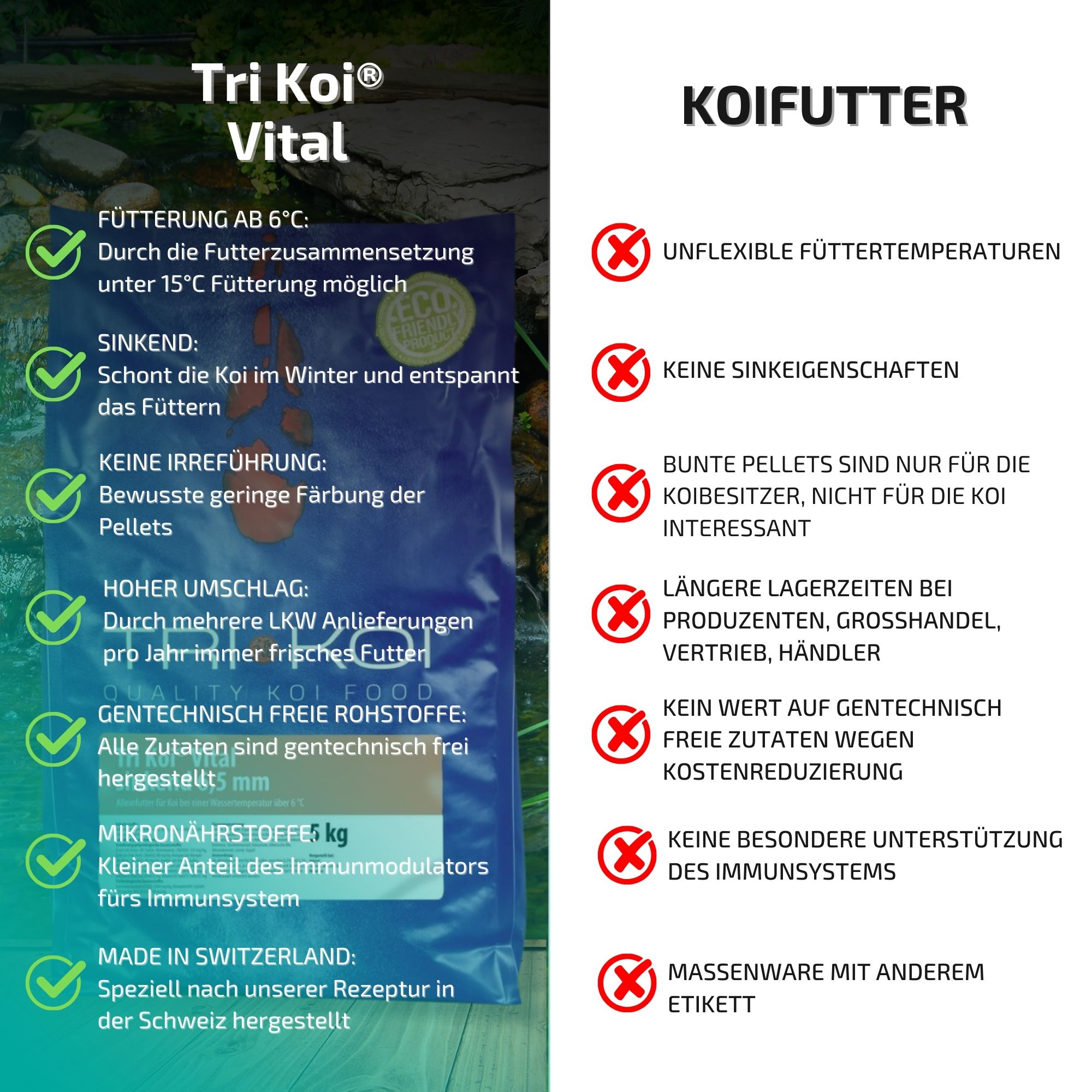 Ze produceren voor ons visvoer dat speciaal is afgestemd op koi en dat het exclusieve micronutriëntencomplex AQUACULTURE GUARD® bevat. Deze stof zit in al onze voersoorten van Hokovit en bevat meer dan 60 verschillende kruiden- en plantenextracten die perfect op elkaar zijn afgestemd. Zo is onze Tri Koi® Standard-voerserie ontstaan. Wij zijn ervan overtuigd dat de kwaliteit uw koi zal bekoren. Dat de kwaliteit enerzijds zeer hoog is en anderzijds de prijs-kwaliteitverhouding toch klopt, is te danken aan het bedrijf Hokovit. Schenk ons uw vertrouwen in onze beslissing. U zult, net als wij, enthousiast zijn over de kwaliteit. Wij hebben de kwaliteitsnorm met dit koivoer aanzienlijk verhoogd. U zult het onmiddellijk merken aan het gedrag van uw koi.