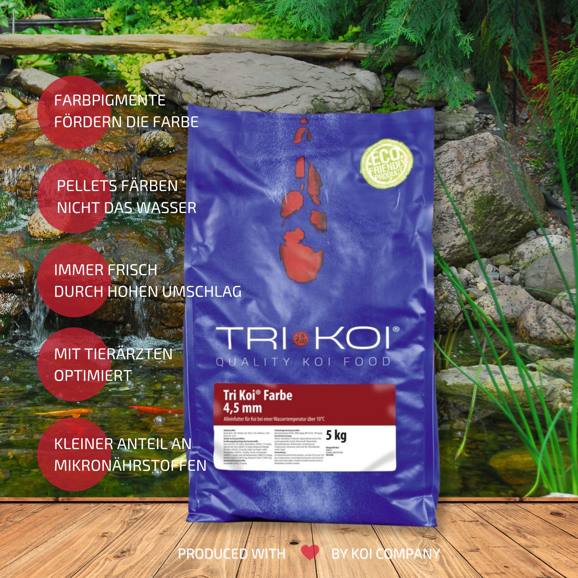 Tri Koi® Farbe ondersteunt door de speciale samenstelling de kleurpigmenten van de koi, die in de huid zitten, om de kleuren goed tot hun recht te laten komen. Het is een volledig voer, maar het kan ook met andere voersoorten worden gemengd.