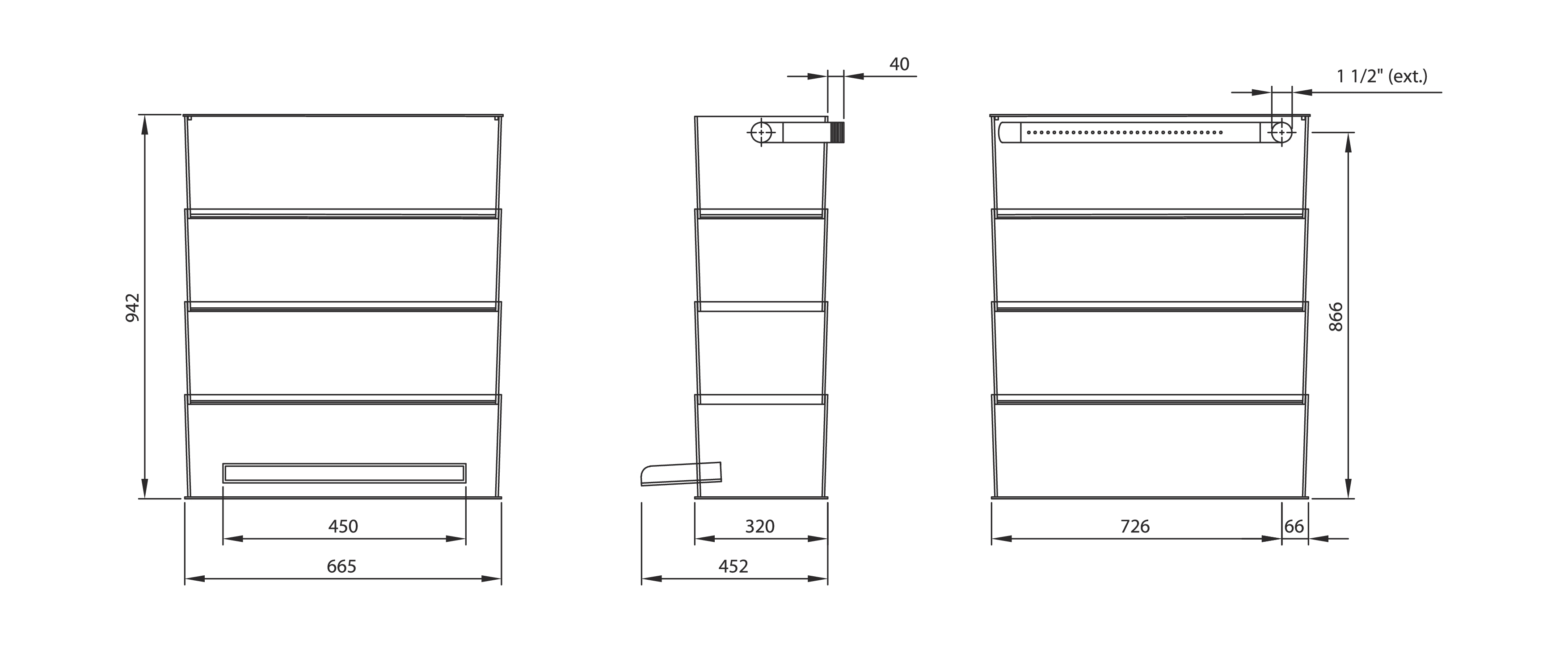 Afmetingen: L x B x H 665 x 452 (500 met lip) x 942 mm