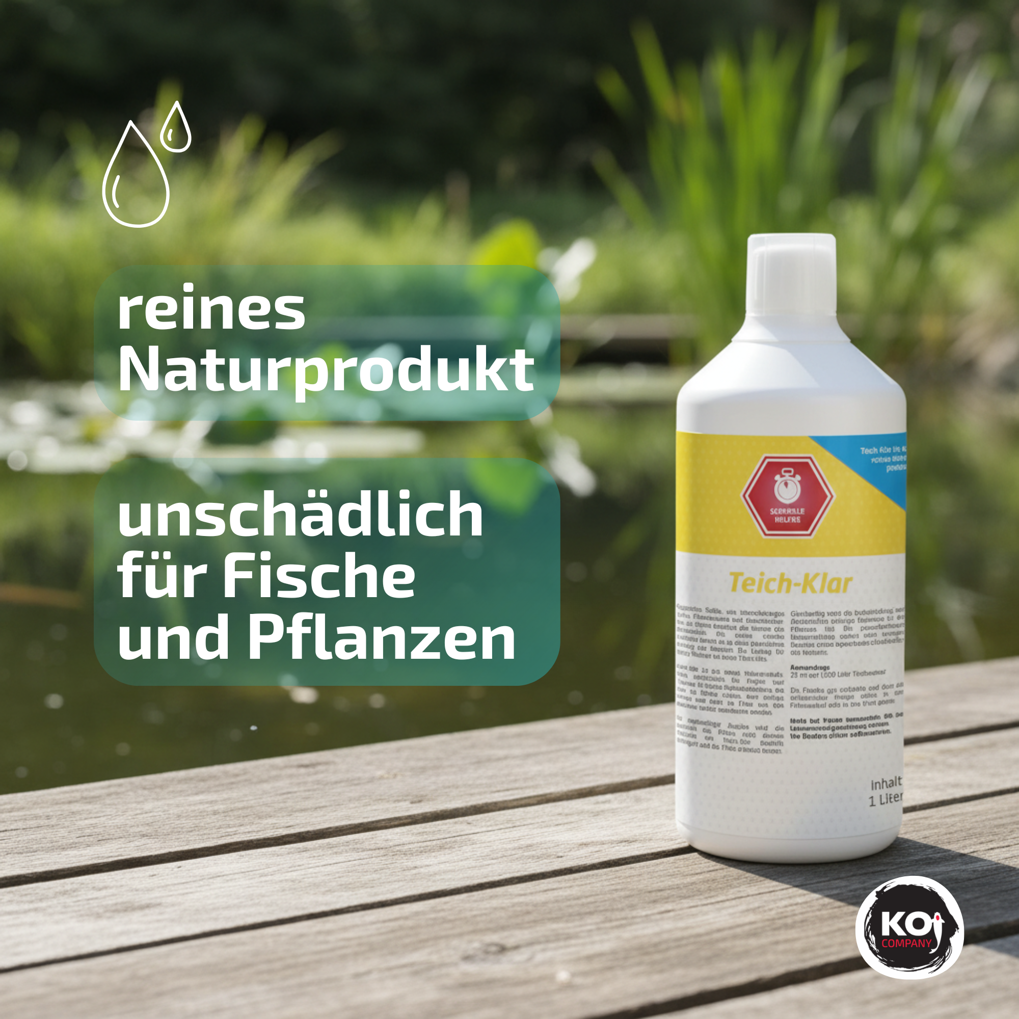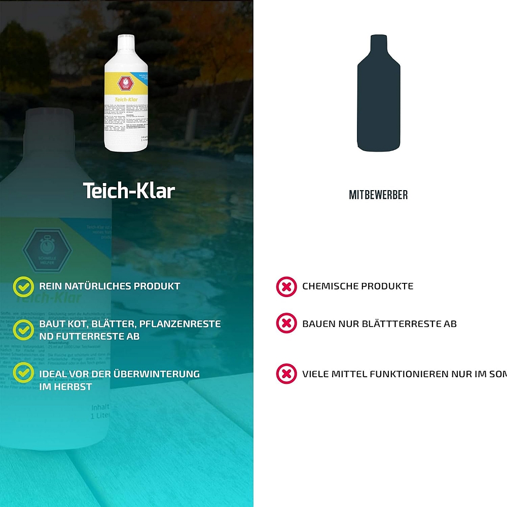 Teich-Klar is een puur natuurproduct, volledig onschadelijk voor vissen en planten. Het bindt zwevende deeltjes, die vervolgens naar de bodem zakken, daar worden afgebroken en in het filter volledig door bacteriën worden verwerkt. Het is in de herfst ideaal om de organische resten voor de winter af te breken.
