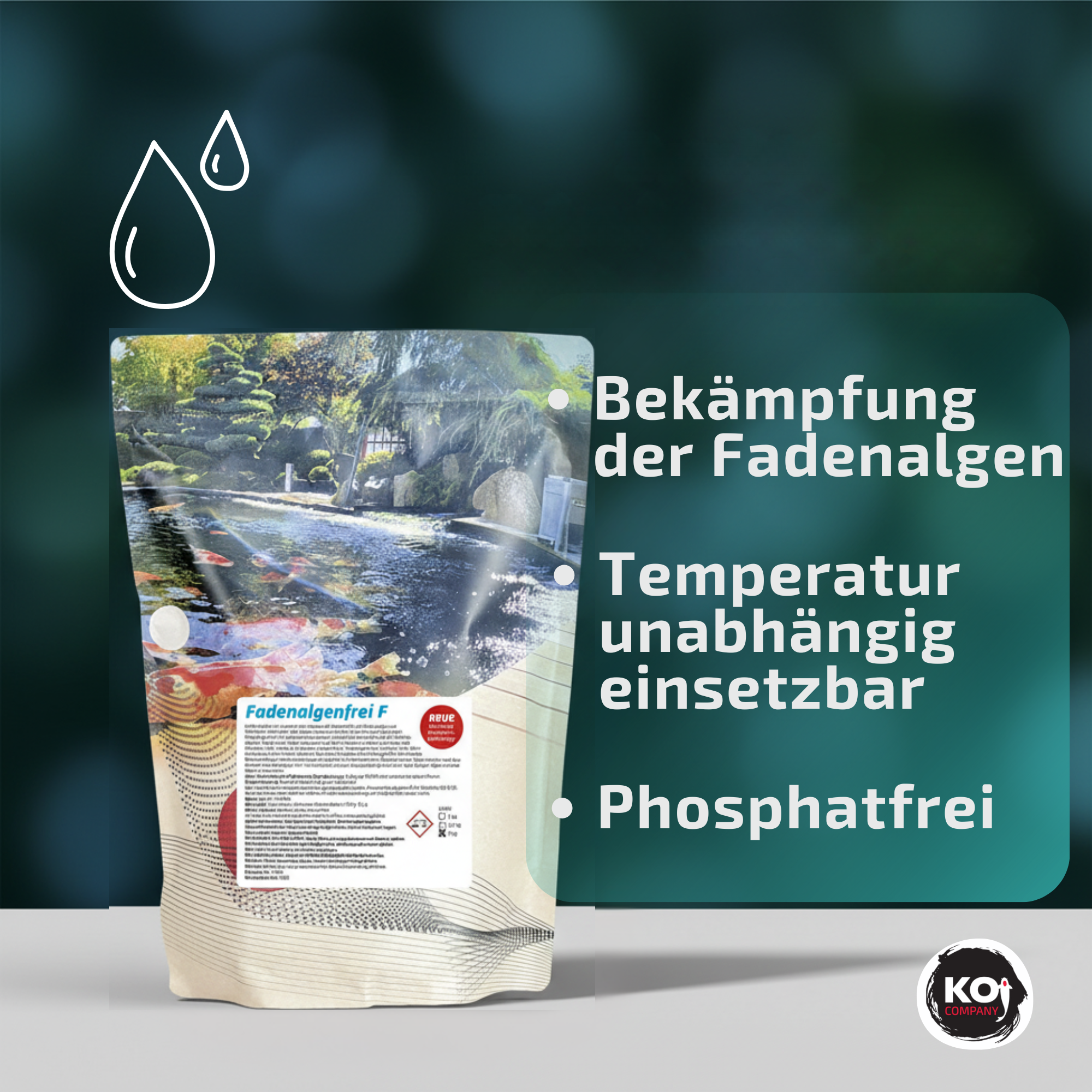 De draadalgenverdelger "Fadenalgenfrei F" van Koi Company bestaat uit levensmiddelenadditieven en is zelfs bij een overdosering (tot drie keer de hoeveelheid) onschadelijk voor vissen en planten. Dit middel tegen vijveralgen zou zelfs geschikt zijn voor menselijke consumptie, omdat het geen algiciden of biociden bevat. U koopt een draadalgenverdelger die de oorzaak – namelijk de algen – bestrijdt en dankzij zijn werkzame stoffen uw vijver vrij houdt van vervelende dode algen, omdat deze niet in dezelfde mate teruggroeien als bij andere middelen. Om ervoor te zorgen dat Fadenalgenfrei F ook bij u werkt, dient u rekening te houden met het volgende: De dosering moet overeenkomen met het werkelijke watervolume. Geef liever iets meer dan te weinig.