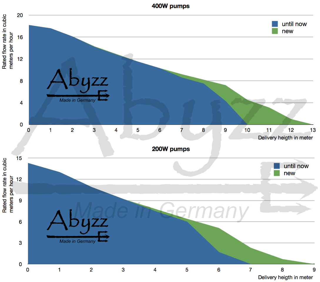 "Made in Germany" - vanaf nu met nog meer vermogen - Bij alle Abyzz-pompen die vanaf nu worden geleverd, is de maximale opvoerhoogte met ca. 30% verhoogd, terwijl tegelijkertijd het debiet in dit bereik aanzienlijk toeneemt.