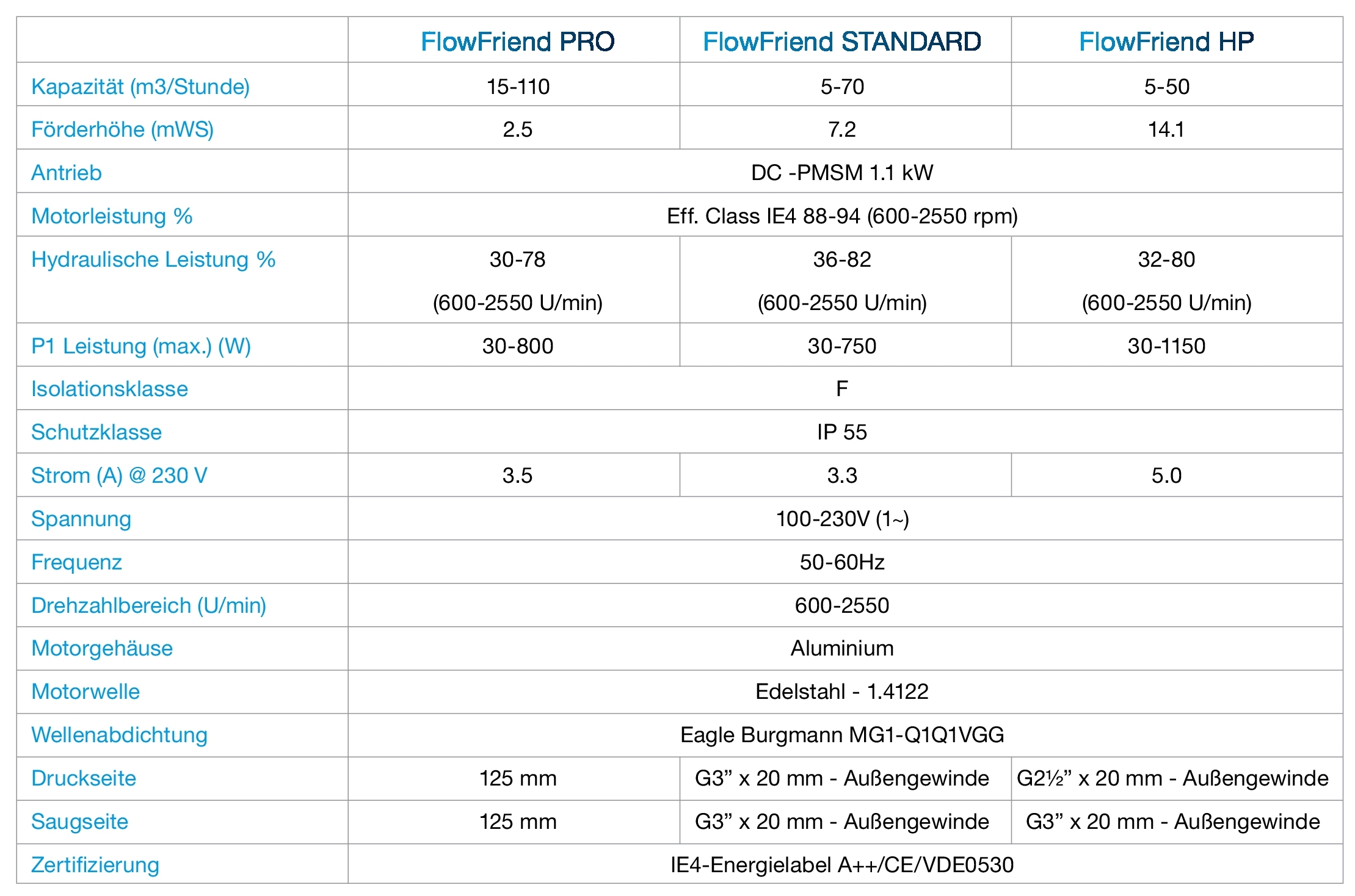 De FlowFriend is een zeer geavanceerde pomp die zeer energiezuinig is en nu al het hoogste minimale rendement (MEI) van meer dan 0,7 heeft. De minimale efficiëntie (Minimum Efficiency Index/MEI) is afhankelijk van zowel het motorvermogen als de hydraulica van de pomp. Deze werd in 2012 door de Europese richtlijn voorgeschreven om de energie-efficiëntie van waterpompen te verhogen. De buitengewone efficiëntie van de FlowFriend wordt duidelijk als men bedenkt dat de EU vanaf juli 2014 een minimale efficiëntie van 0,4 voorschrijft.