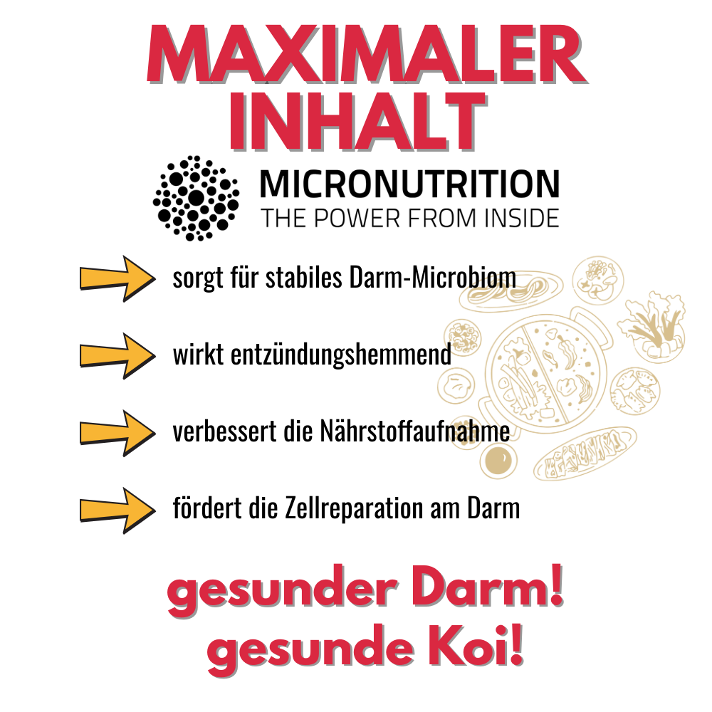 Dankzij de hoogwaardige ingrediënten en grote hoeveelheden premium vismeel, micronutriënten en immuunstimulerende middelen garandeert dit voer een uitzonderlijke groei van de koi.