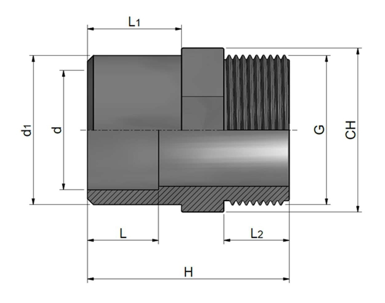 | (d) Binnendiameter links | (d1) Buitendiameter links | (G) Diameter schroefdraad | L | (L1) Lengte lijmnippel | (L2) Lengte schroefdraad | (H) Totale lengte | (CH) Diameter (grootste) | Gewicht |